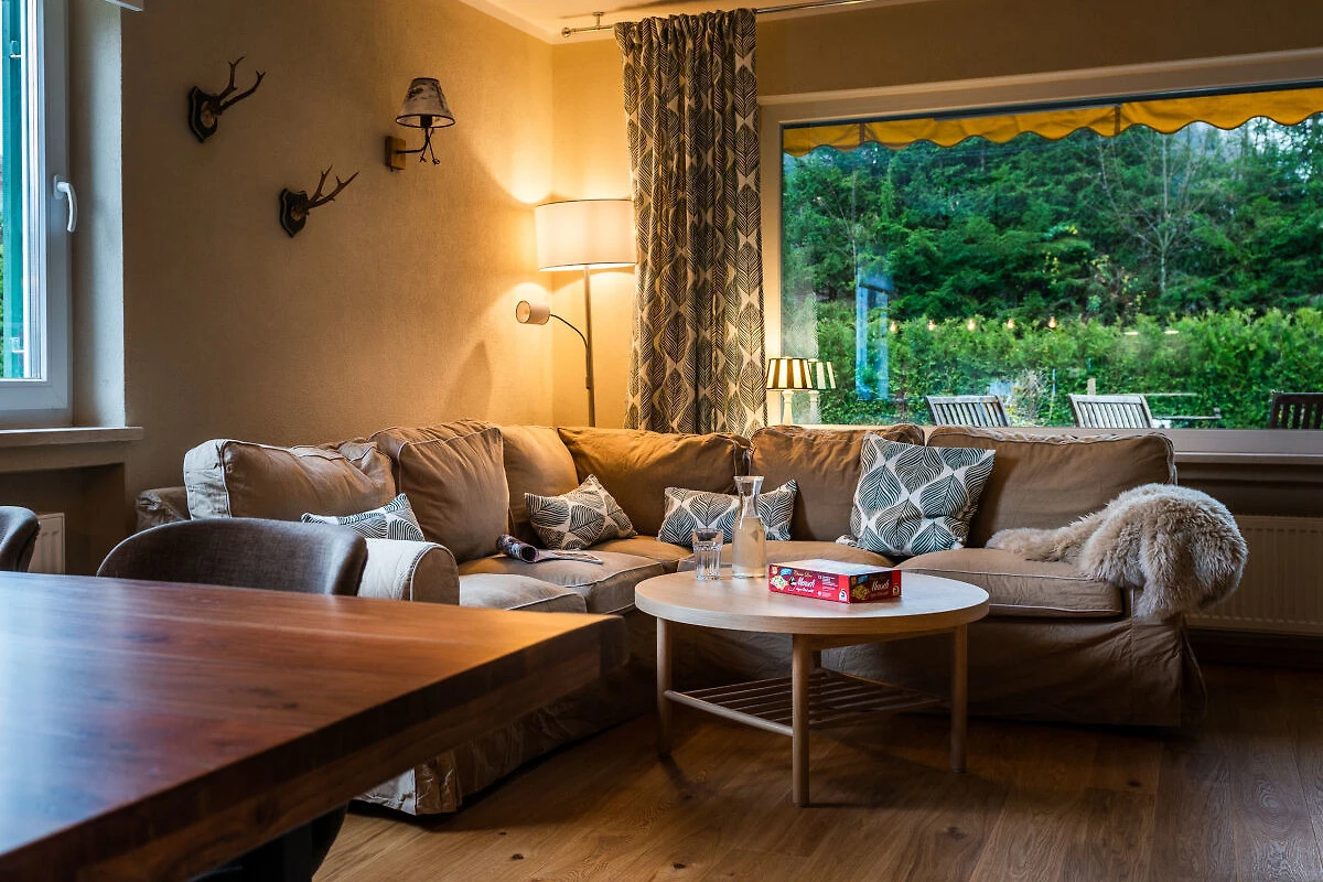 Das stilvolle Wohn-Esszimmer lädt zum Verweilen ein. Die voll ausgestattete Küchenzeile fügt sich harmonisch in das Ambiente ein, ergänzt durch einen grossen Esstisch für gesellige Stunden und ein gemütliches Ecksofa zum Entspannen. Geniessen Sie den spektakulären Ausblick auf die majestätische Alpspitze und den idyllischen Guidiberg; eine Kulisse wie aus dem Bilderbuch. Für Unterhaltung sorgt der imposante 102-Zoll-Fernseher mit direktem Netflix-Zugang, sodass Sie Ihre Lieblingsserien und Filme bequem geniessen können.