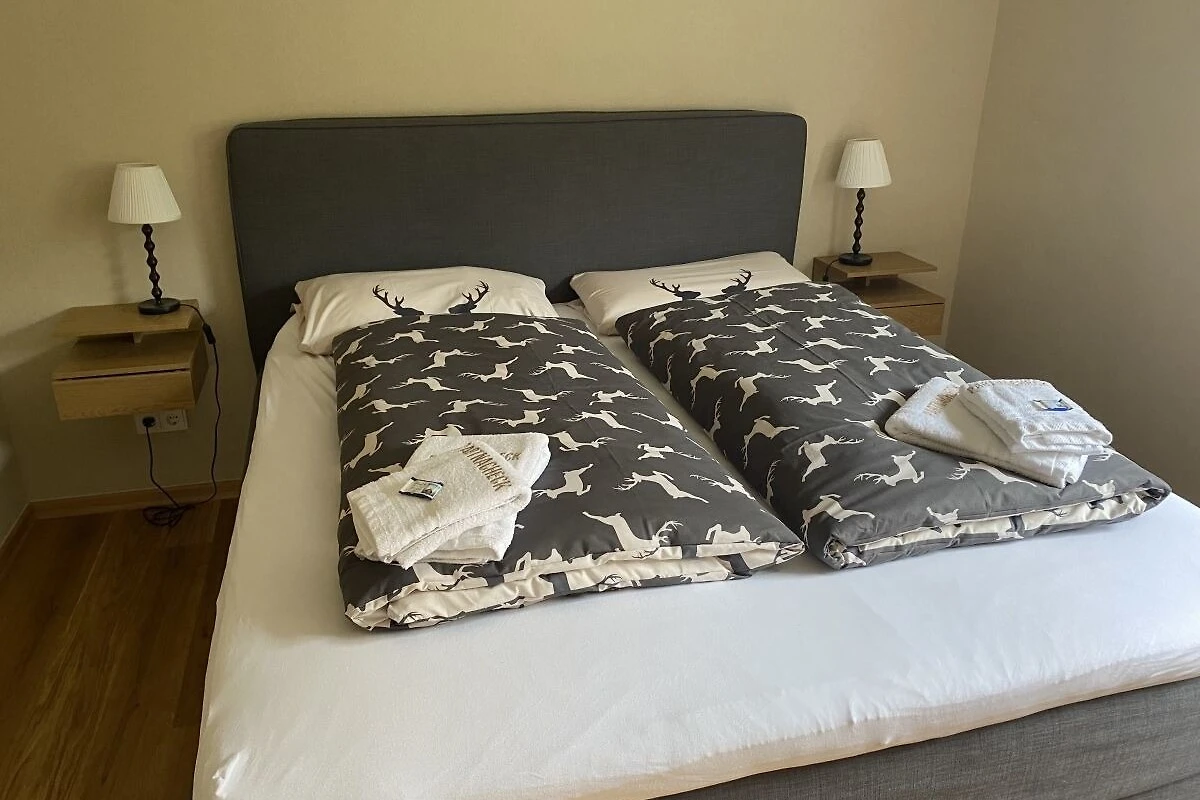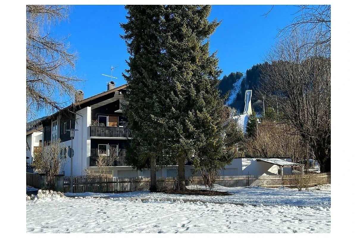 Im behaglichen Schlafzimmer erwartet Sie ein erstklassiges Boxspringbett, das erholsamen Schlaf garantiert. Ein grosszügiger Kleiderschrank sorgt für ausreichend Stauraum, während der Blick aus dem Fenster direkt auf die imposante Skisprungschanze fällt – ein Highlight für Sportbegeisterte und Naturliebhaber gleichermassen.