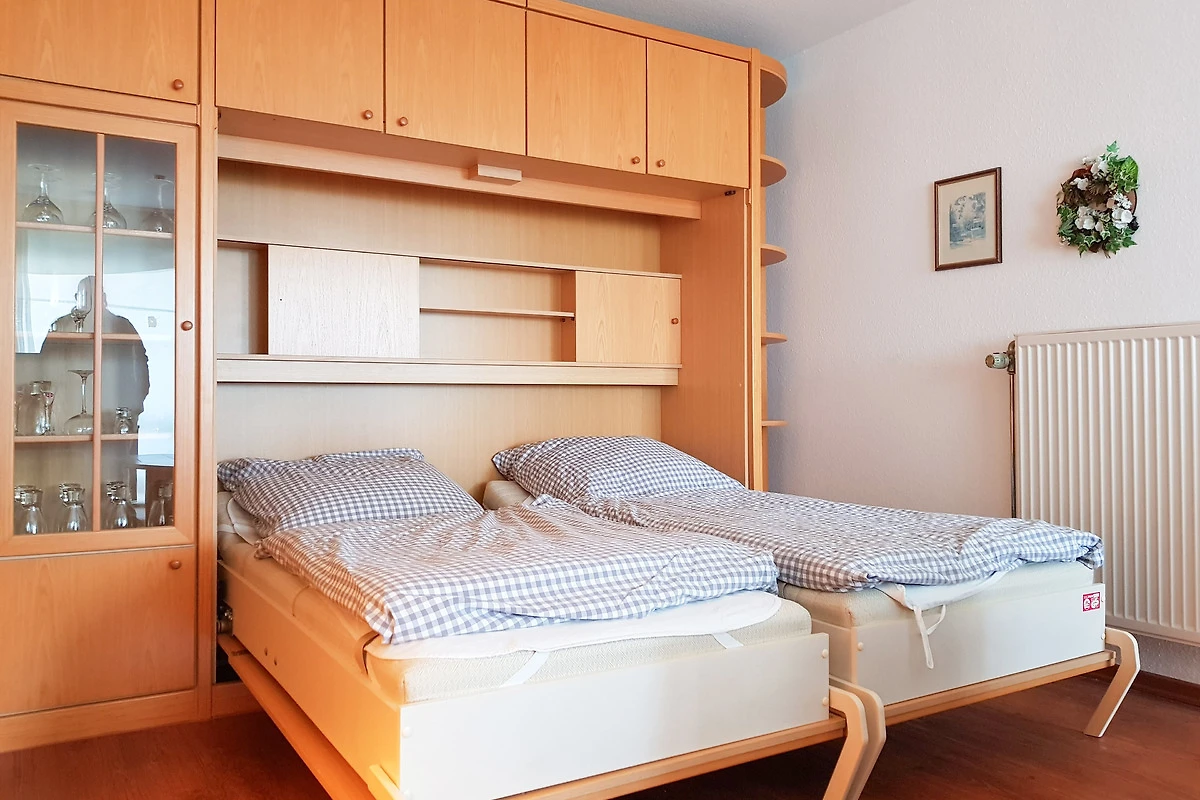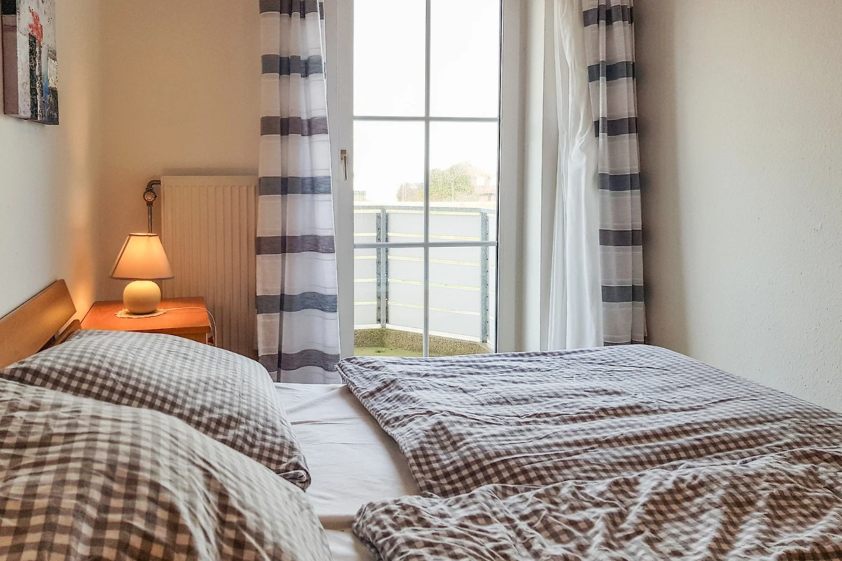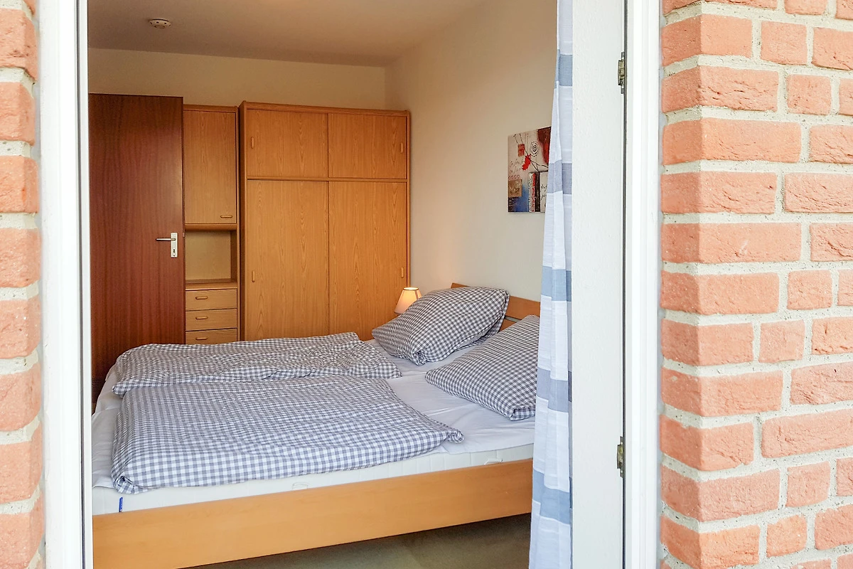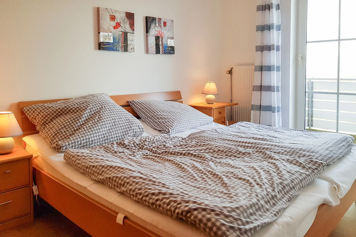 Darüber hinaus verfügt die Ferienwohnung über ein separates Schlafzimmer mit Doppelbett, Kleiderschrank und Zugang zum Balkon.