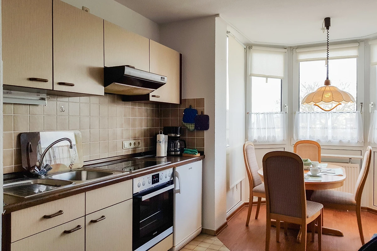 In dem bezaubernden Ostseebad Dahme lässt es sich herrlich relaxen. Wer hier seine Ferien verbringt, kann sich auf ein paar ganz entspannte Tage am Meer freuen. Die hübsche Ferienwohnung von Familie Krüger ist der ideale Ort, um es sich gemütlich zu machen. Das Wohnschlafzimmer ist ausgestattet mit einem Schrankbett (für 2 Personen, einzeln ausklappbar), 3er Couch, 2 Sesseln, Couchtisch, integrierter Küchenzeile, Essplatz im Erker mit 4 Stühlen und Zugang zum Balkon (Richtung Osten mit Meerblick).