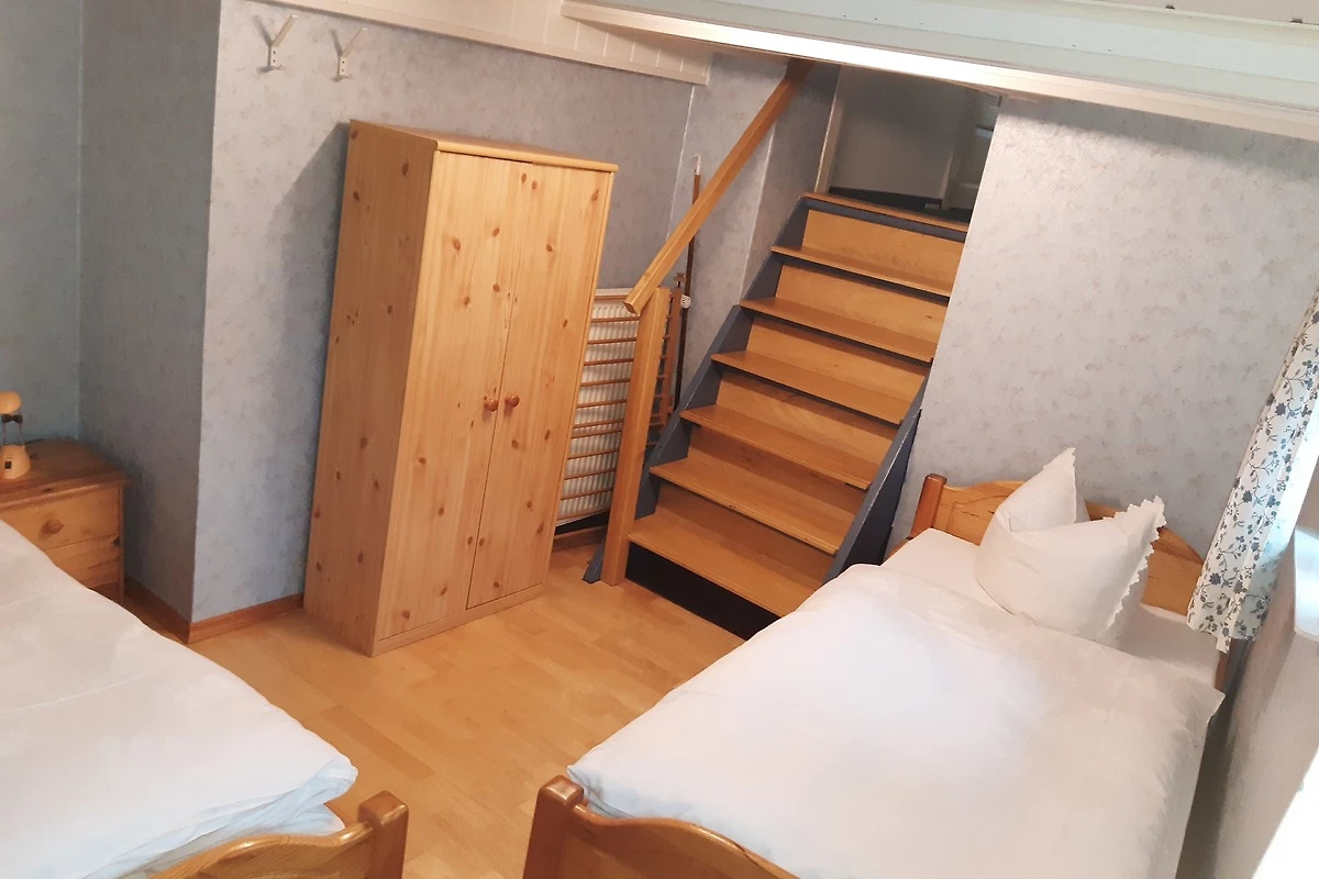 Das Schlafzimmer mit den zwei Einzelbetten ist über eine steile Treppe (siehe Fotos) zu erreichen, die oben im Flur mit einem Kindersicherheitsgitter abgetrennt werden kann (oder man schliesst einfach die Tür).
