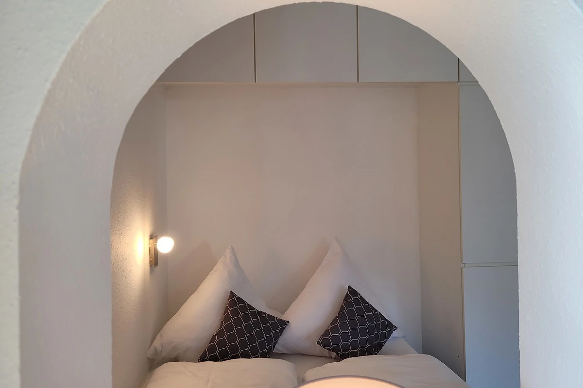 Das kuschelige Bett ist romantisch in einer Nische separiert, durch einen Rundbogen blickt man auf das Wohnzimmer.