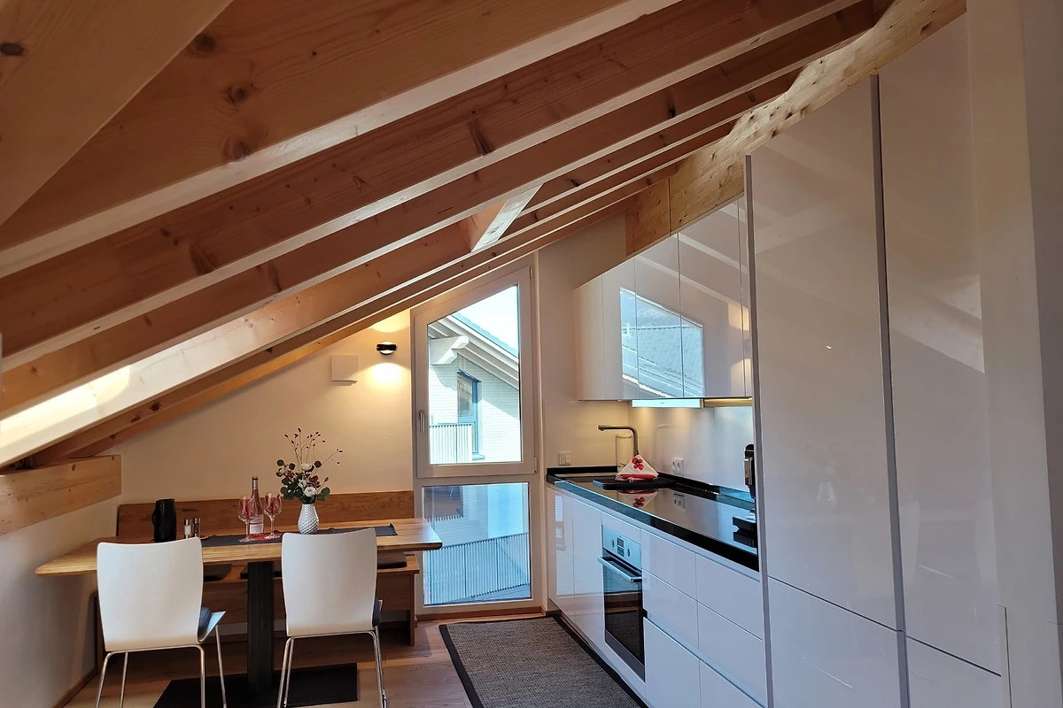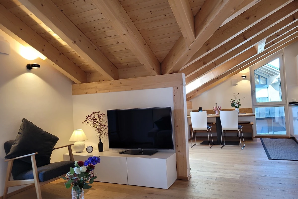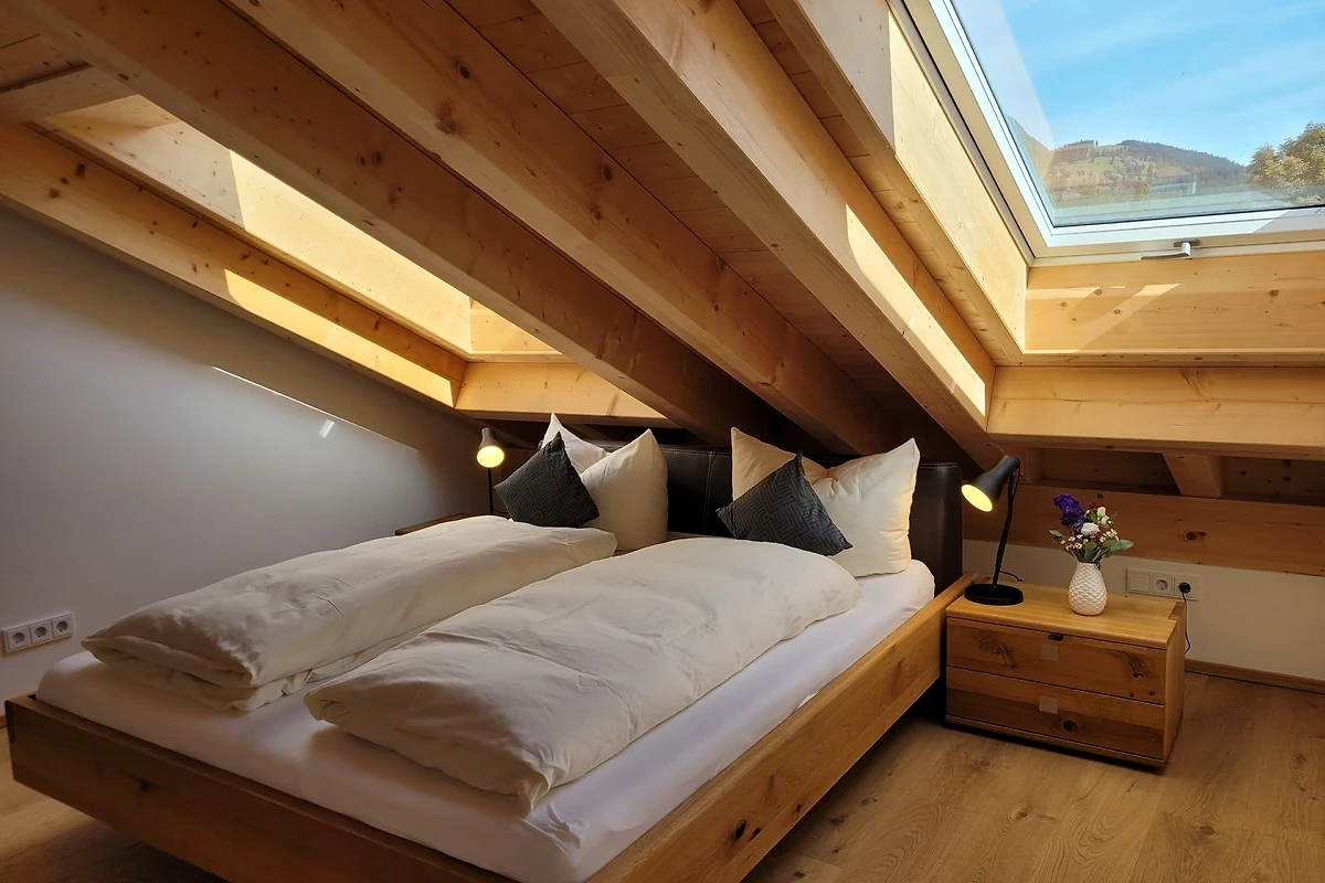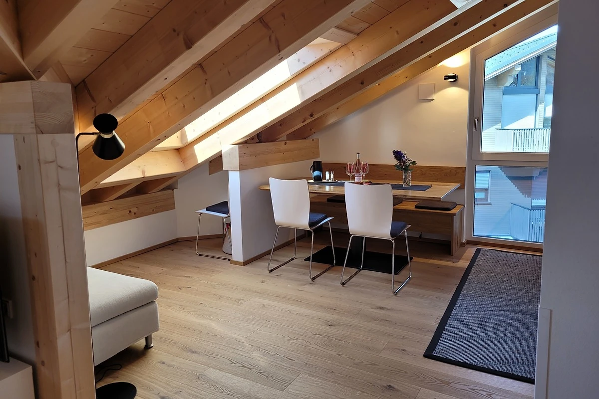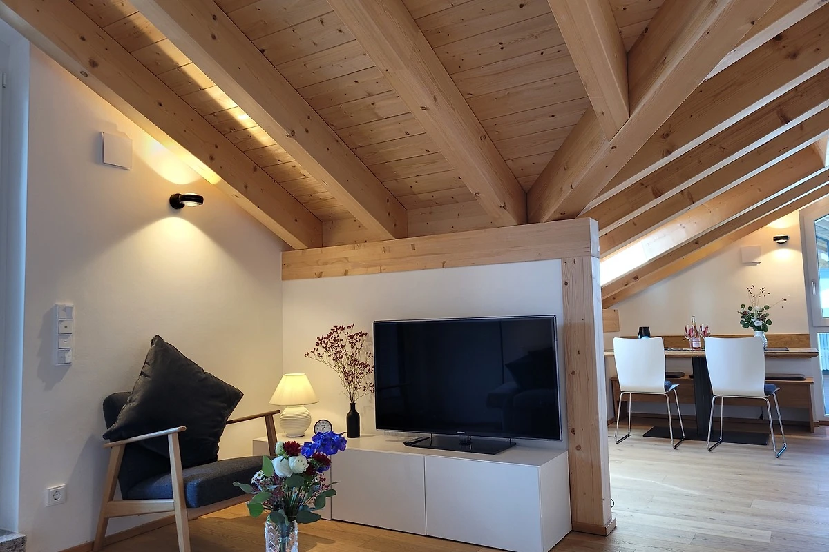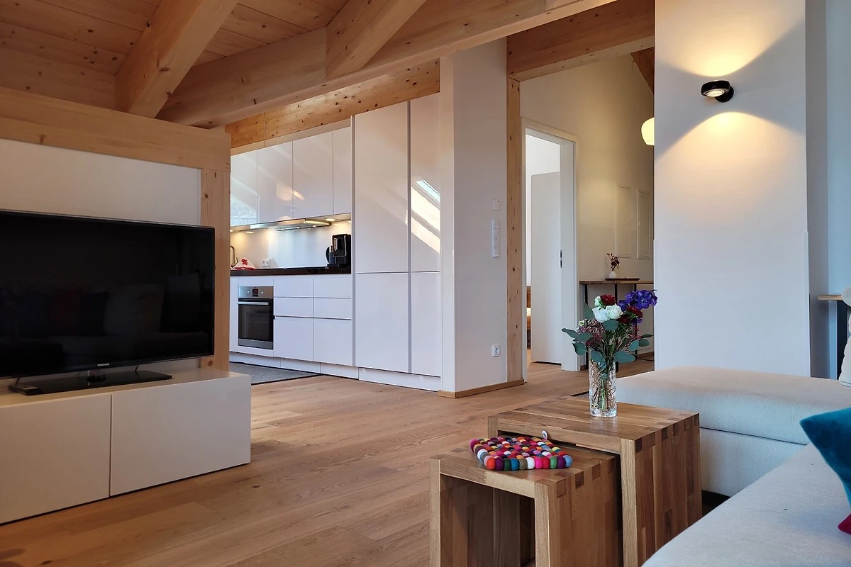 Die qualitativ sehr hochwertig ausgestattete Ferienwohnung bietet angenehmsten Komfort für bis zu 4 Personen. Der hohe offene Dachstuhl, die Dachfenster, die nachhaltigen Eichen Massivholzmöbel und das Eiche-Naturholzparkett mit Fussbodenheizung garantieren eine Wohlfühlgemütlichkeit und strahlen eine alpenländische Atmosphäre aus.