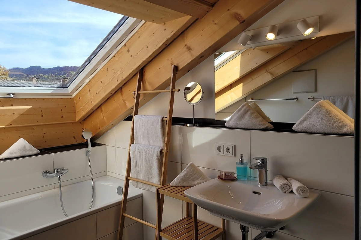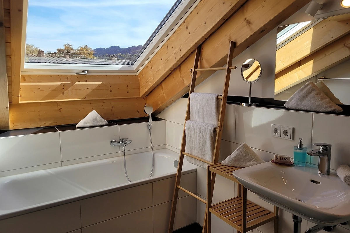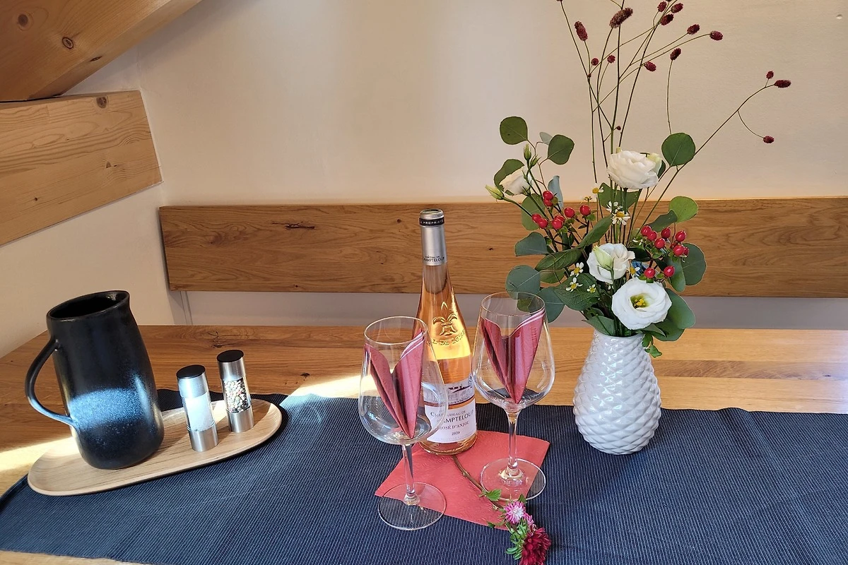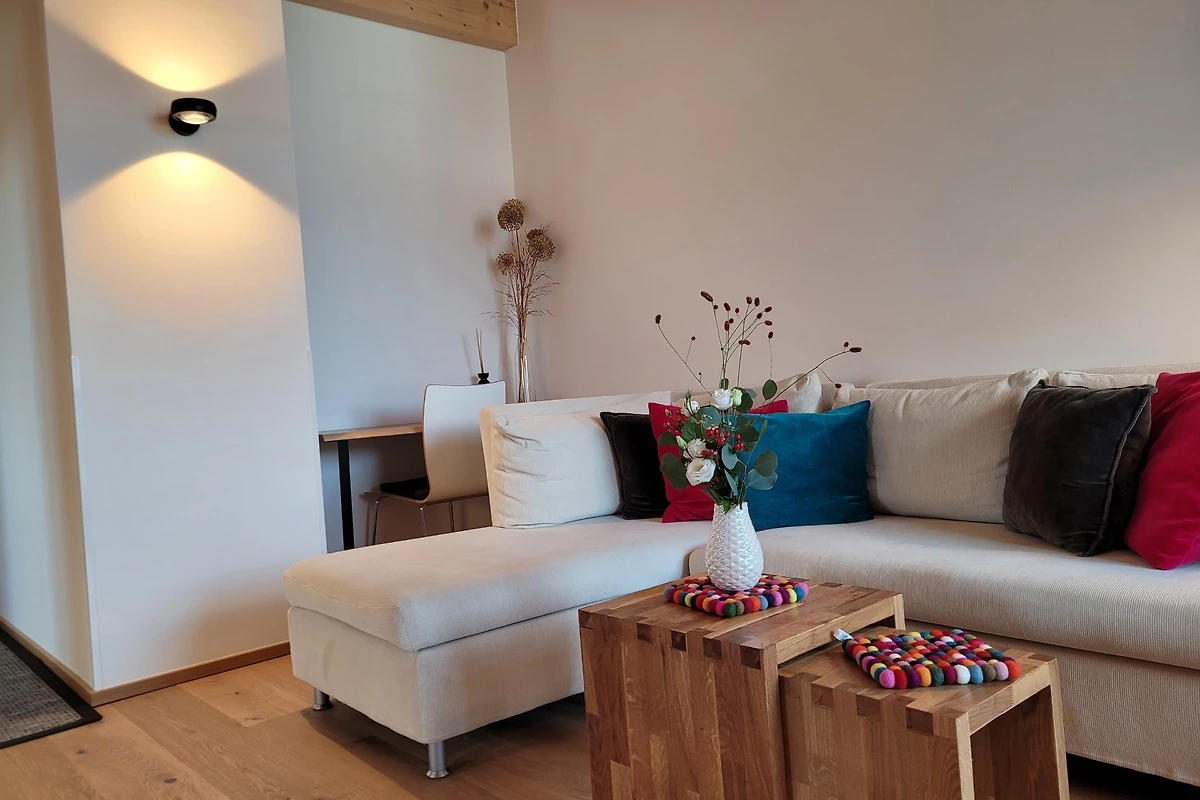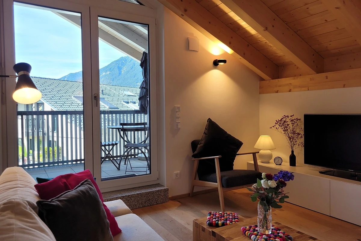 Die qualitativ sehr hochwertig ausgestattete Ferienwohnung bietet angenehmsten Komfort für bis zu 4 Personen. Der hohe offene Dachstuhl, die Dachfenster, die nachhaltigen Eichen Massivholzmöbel und das Eiche-Naturholzparkett mit Fussbodenheizung garantieren eine Wohlfühlgemütlichkeit und strahlen eine alpenländische Atmosphäre aus.