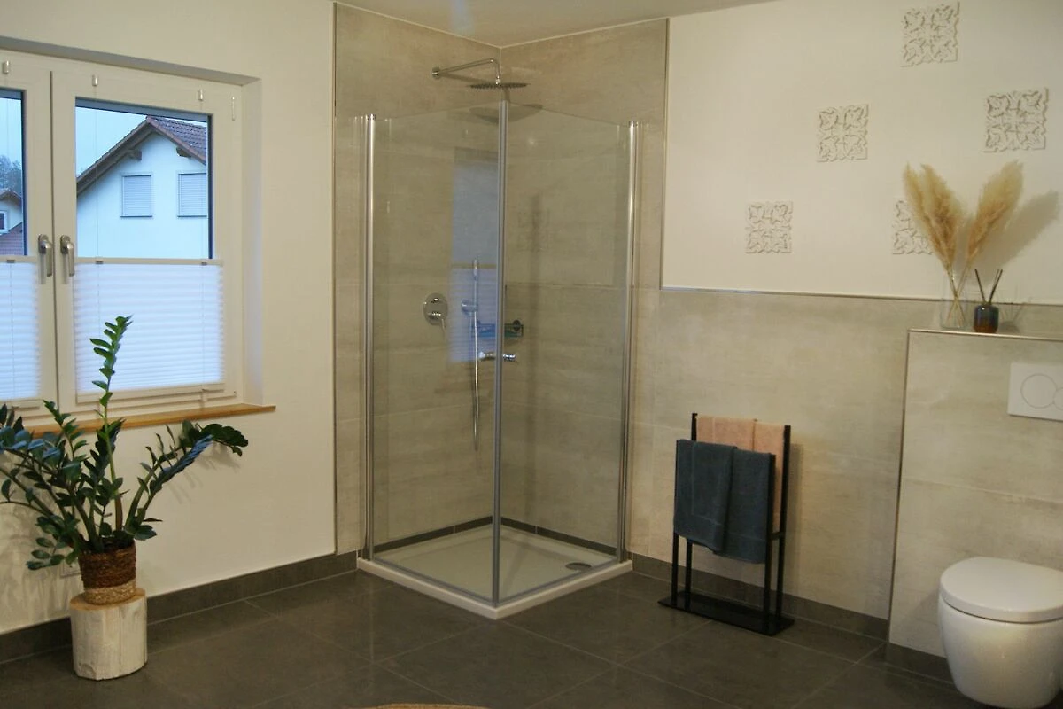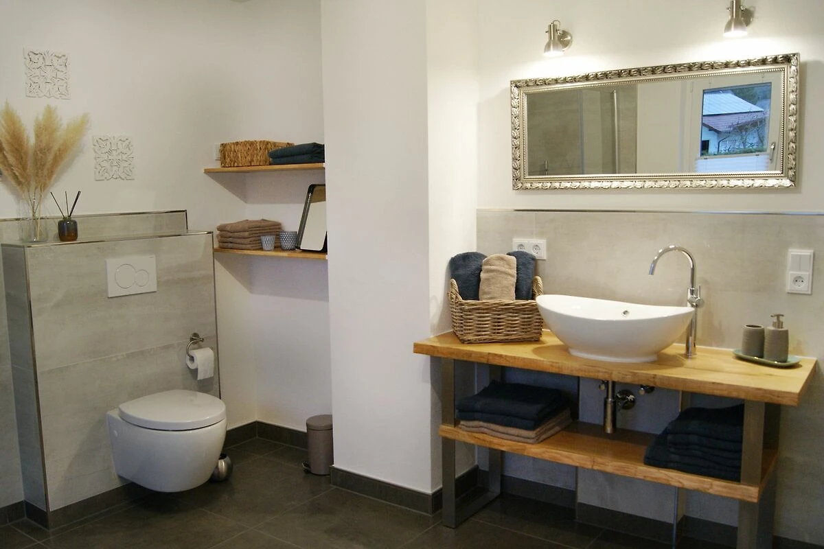 Gerne stellen wir Ihnen ein Kleinkindbett bereit. Das grosse Familien Badezimmer wird über Fussbodenheizung geheizt und ist mit Badewanne, Dusche, WC und Waschtisch ausgestattet. Zusätzlich gibt es ein separates Gäste WC. Die Terrasse erreichen Sie über das Elternschlafzimmer. Hier steht Ihnen eine Sitzgruppe zur Verfügung.