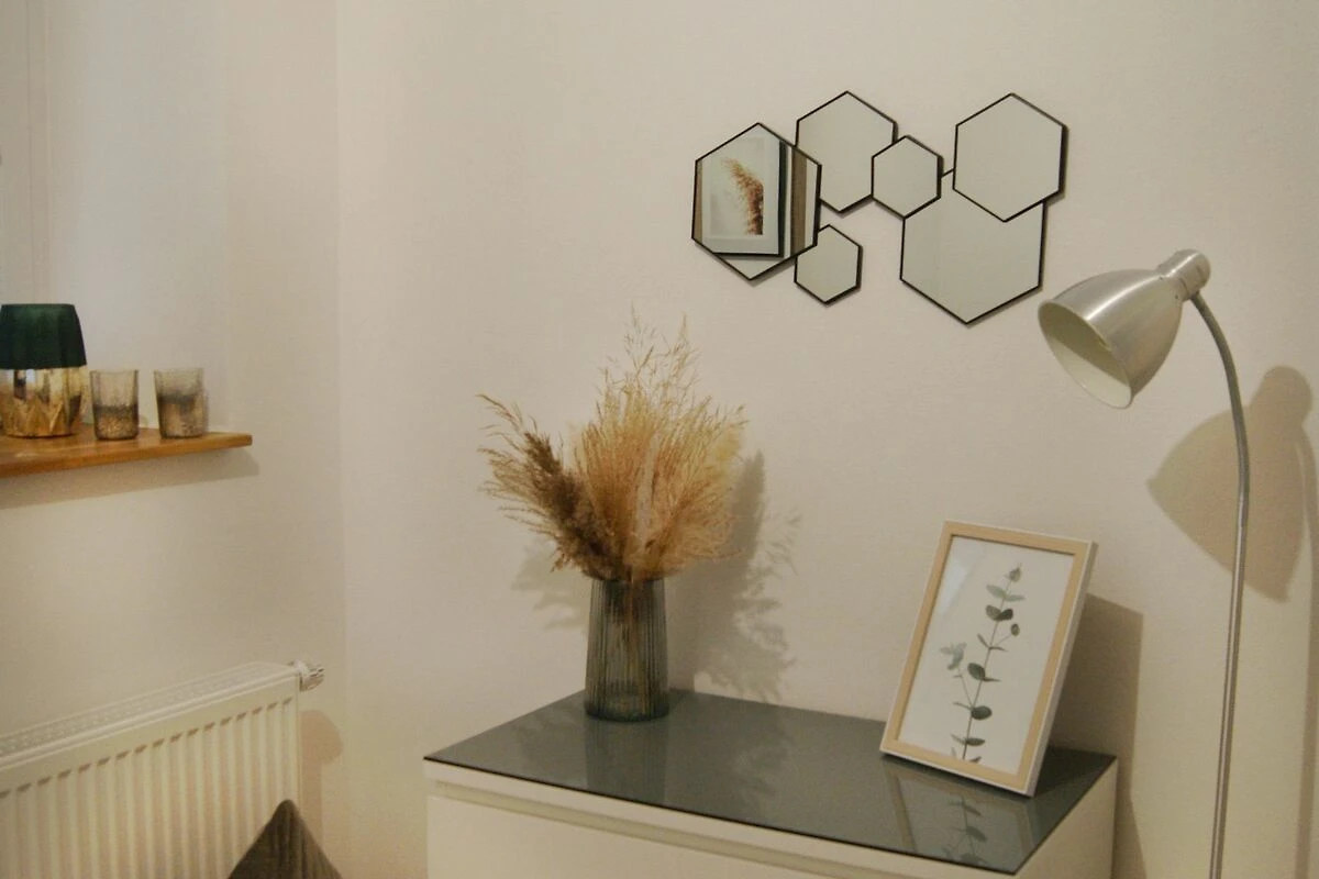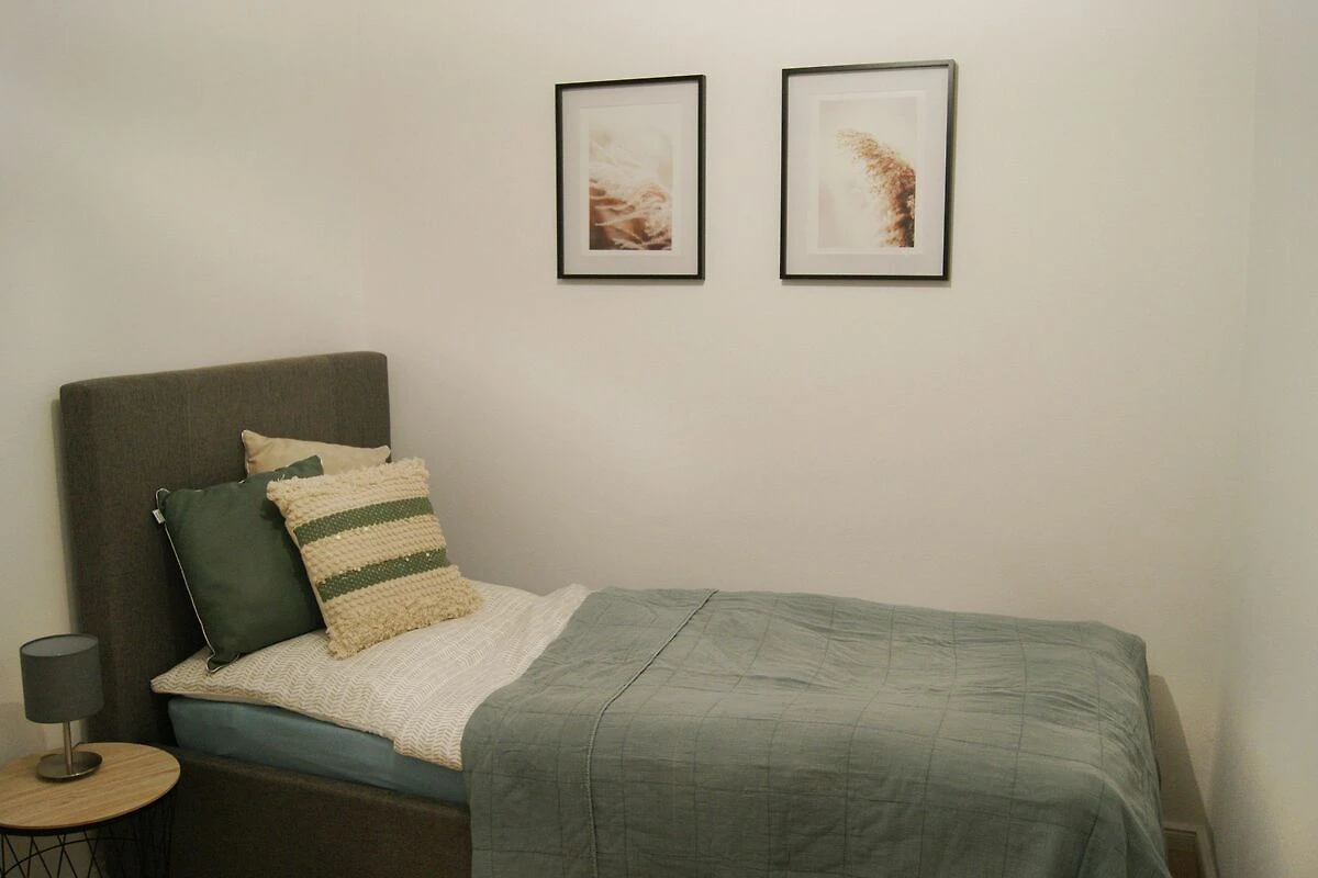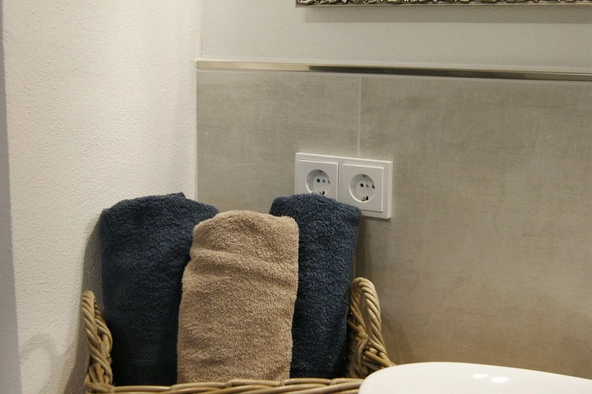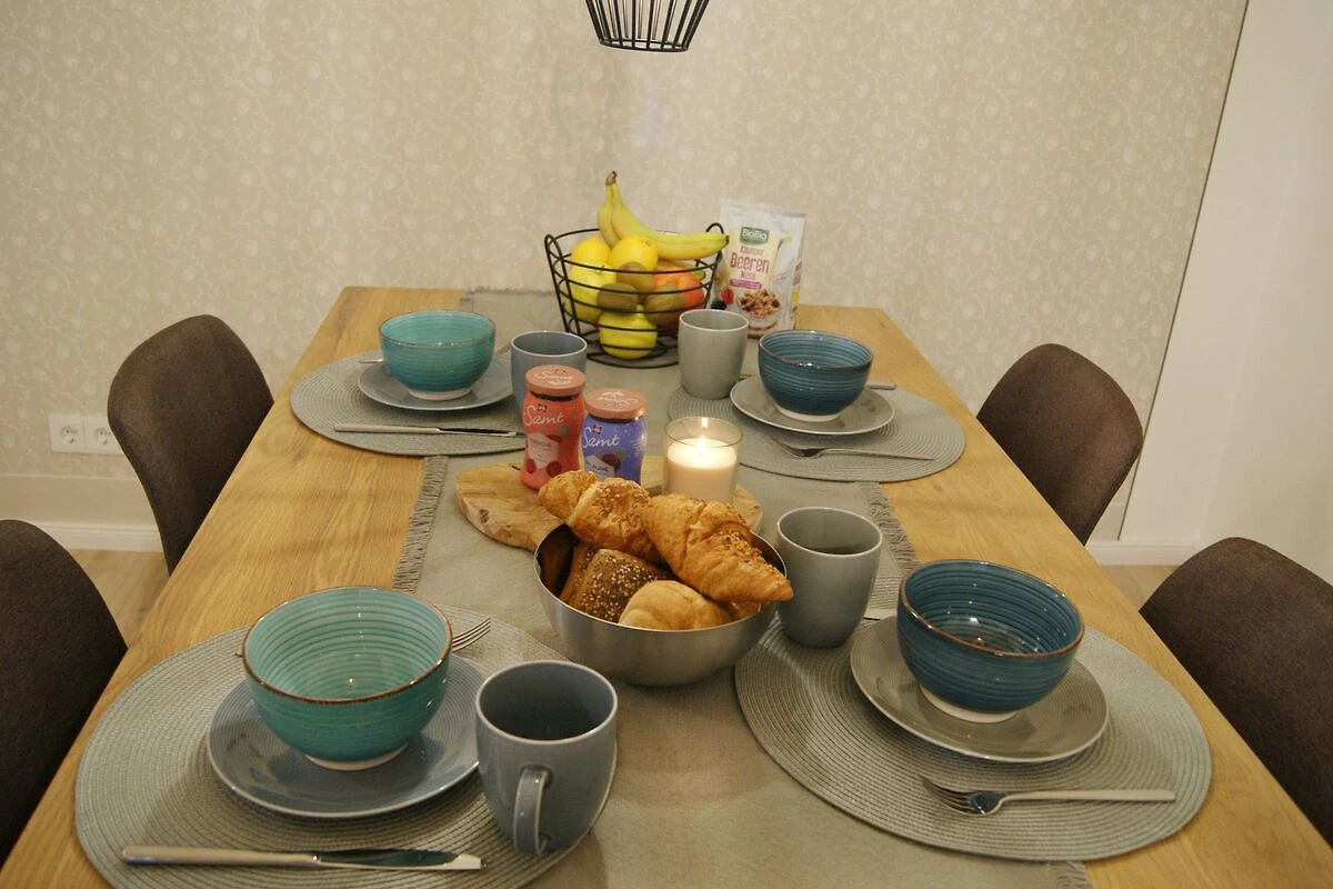 Alle notwendigen Küchenutensilien (Kaffemaschine, Wasserkocher, Geschirr usw.) sind natürlich vorhanden. Der Essbereich bietet ausreichend Platz für 6 Personen zum Frühstücken, Das Schlafzimmer wurde für optimalen Schlafkomfort mit einem Boxspringbett ausgestattet.