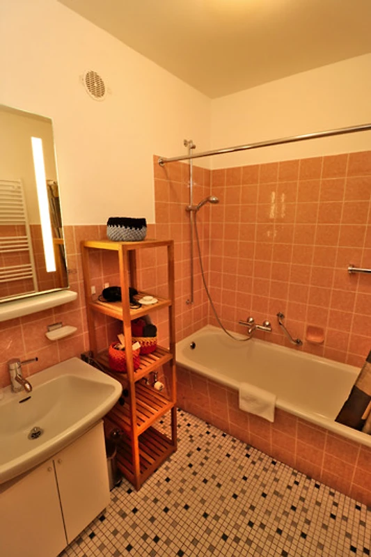 Im Bad befindet sich eine Badewanne mit Duschmöglichkeit.