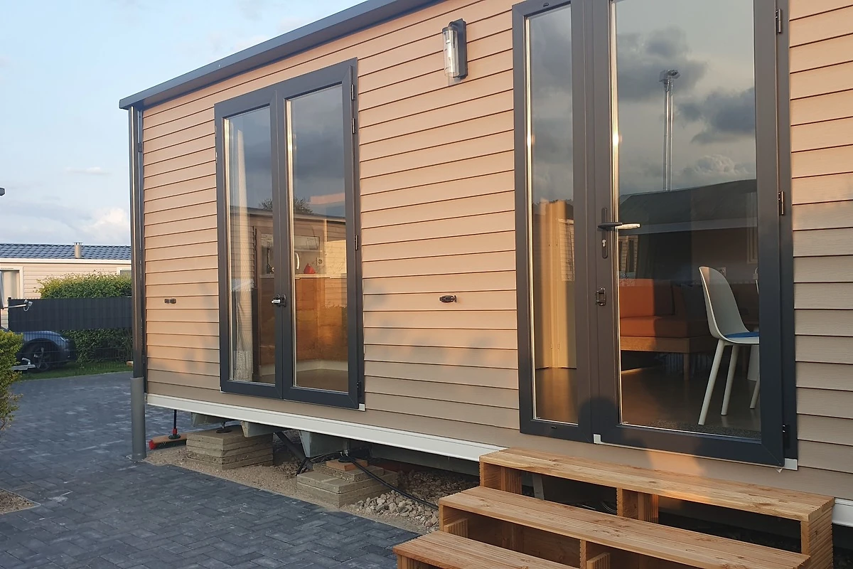 Unsere Mobilheime sind hell und modern ausgestattet und verfügen jeweils über einen kombinierten Wohn-/Essbereich mit integrierter Küchenzeile, 2-3 Schlafzimmern, 1-2 Bädern mit Dusche sowie 1-2 separaten WC. Eines der Bäder ist jeweils direkt von einem der Schlafzimmer aus zugänglich (en-suite). Auf der Terrasse stehen Ihnen ein eigener Strandkorb, ein Tisch mit Bänken und Sonnenschirm sowie ein Grill zur Verfügung. Ein kleiner Gartenbereich sorgt für weitere Entspannungsmöglichkeiten. Ihr Auto parken Sie direkt am Mobilheim.
