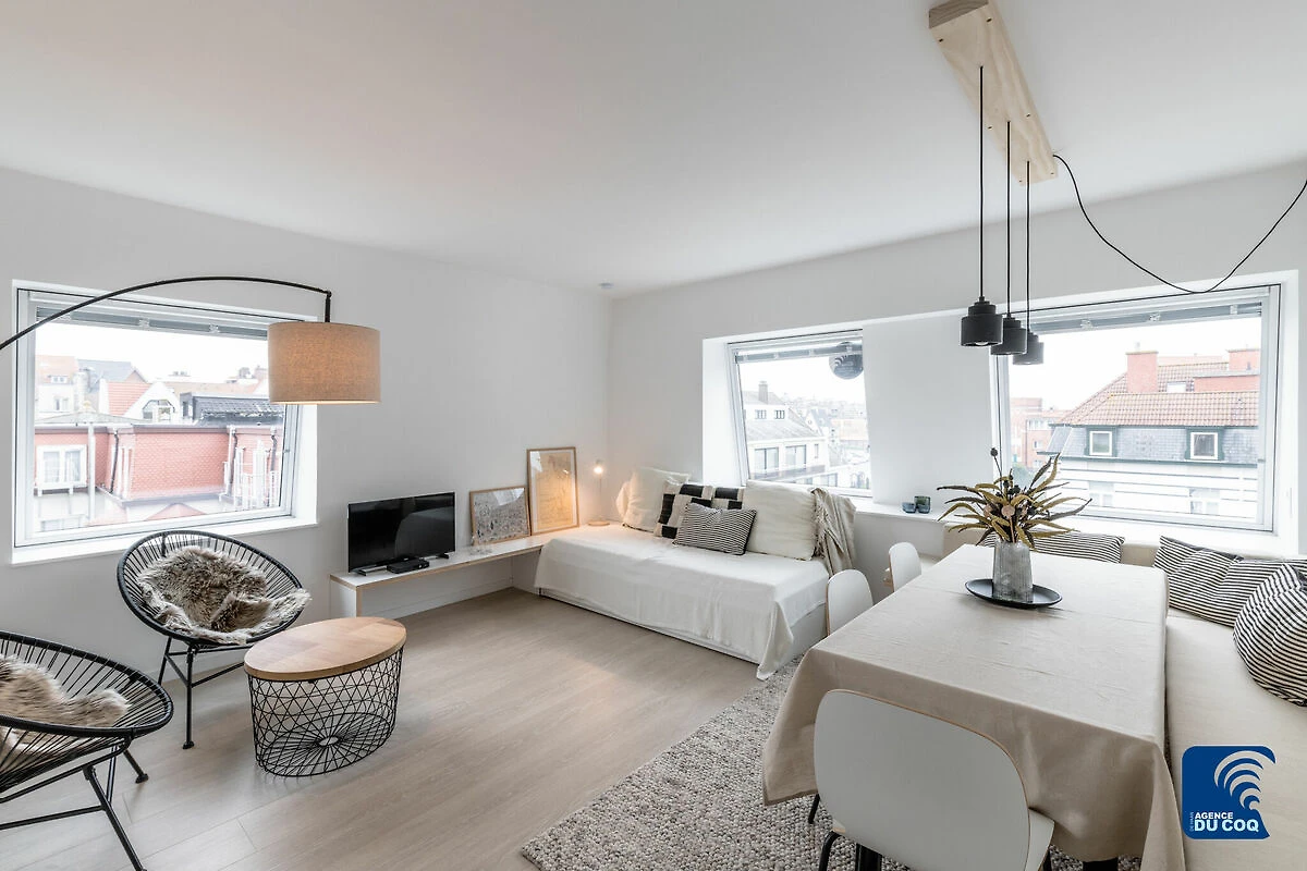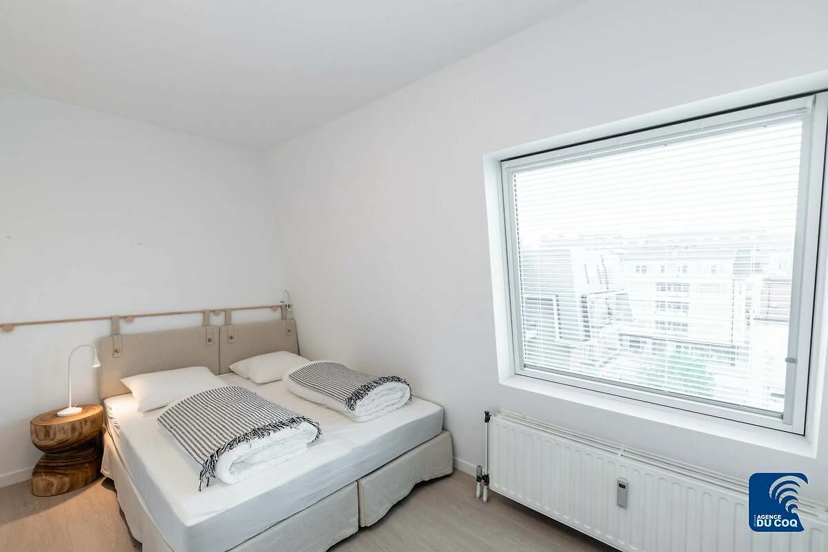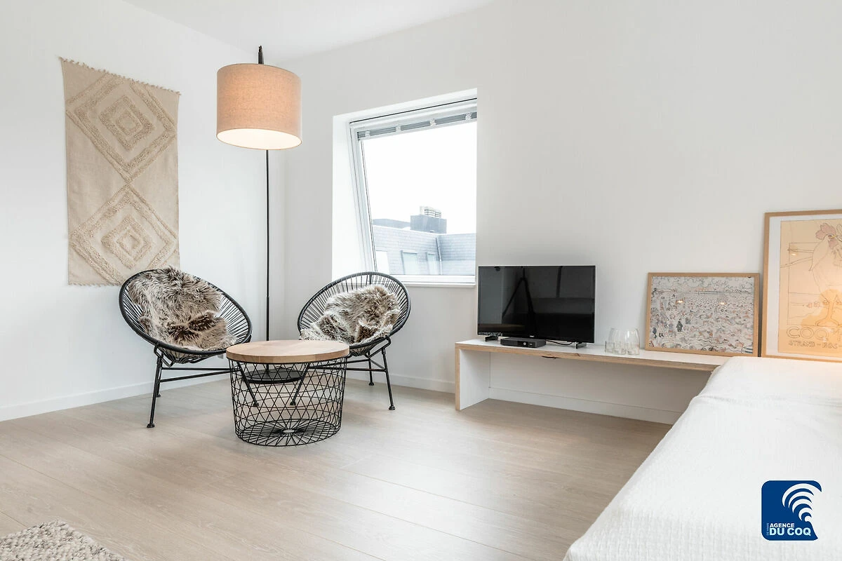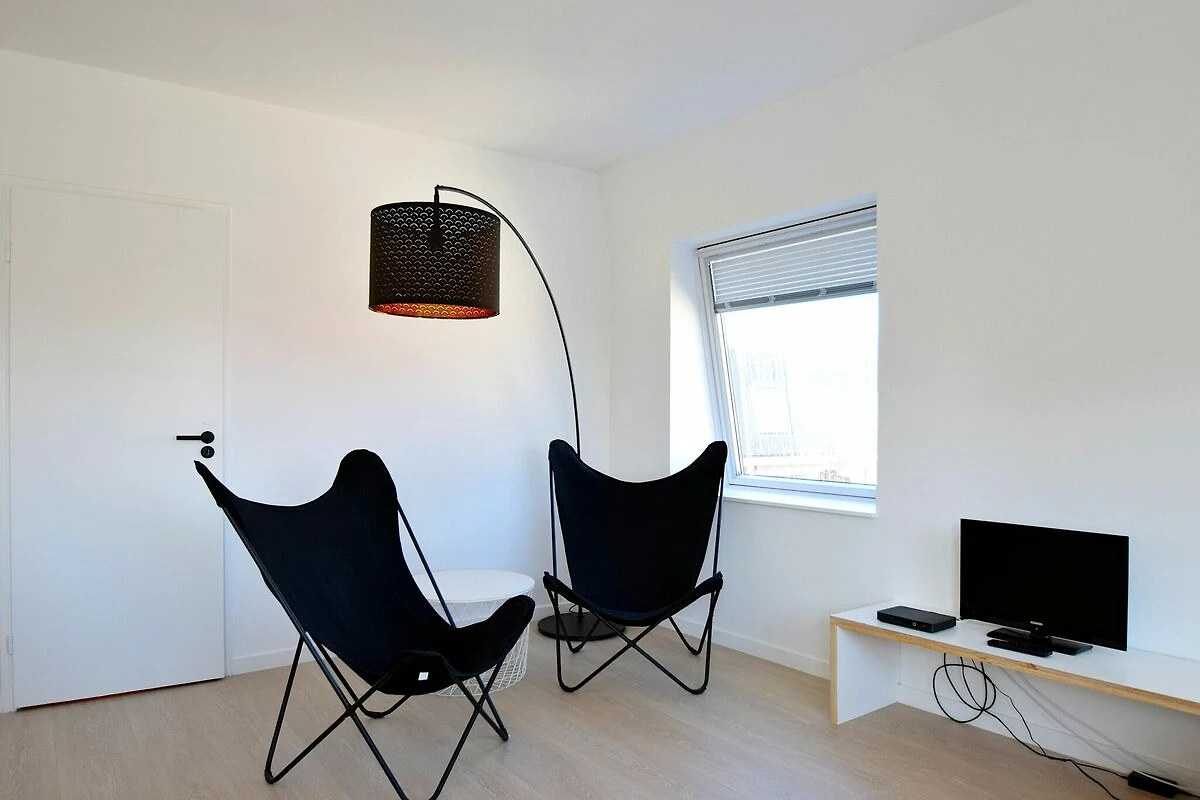 Betreten Sie dieses frisch eingerichtete Apartment nur 150 Meter vom Sandstrand von De Haan entfernt. Das durchdachte Design mit klaren Linien und gemütlichen Akzenten ist perfekt für Paare oder kleine Familien, die einen Urlaub am Meer verbringen möchten. Das Apartment bietet ein gemütliches Wohnzimmer mit Doppelschlafcouch, eine kompakte, aber stilvolle Küche mit allen wichtigen Geräten, darunter Geschirrspüler und Küchenmaschine, sowie einen hellen Essbereich für gemütliche Mahlzeiten nach einem Strandtag.