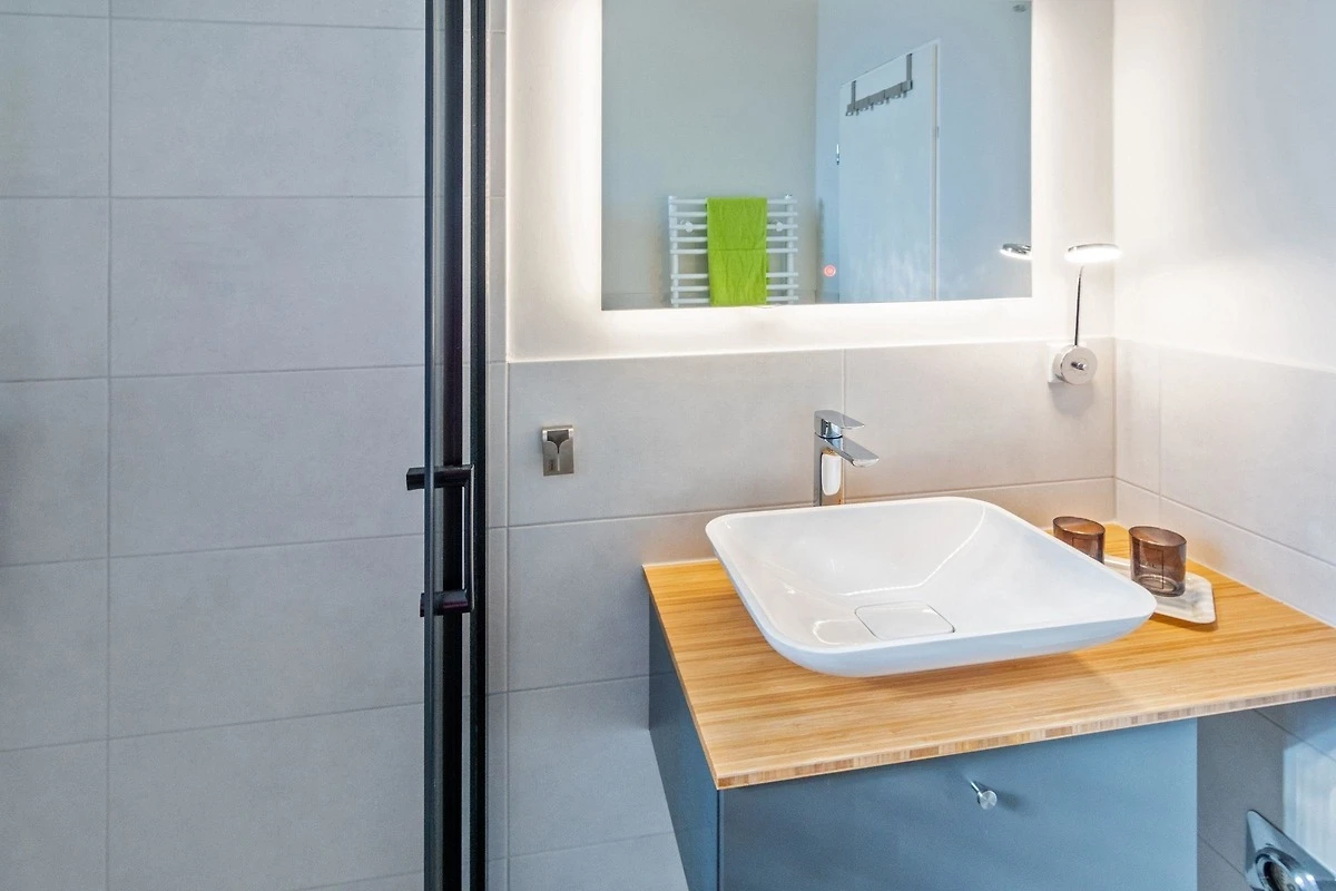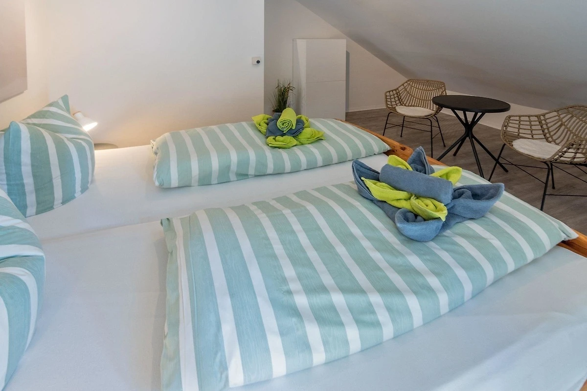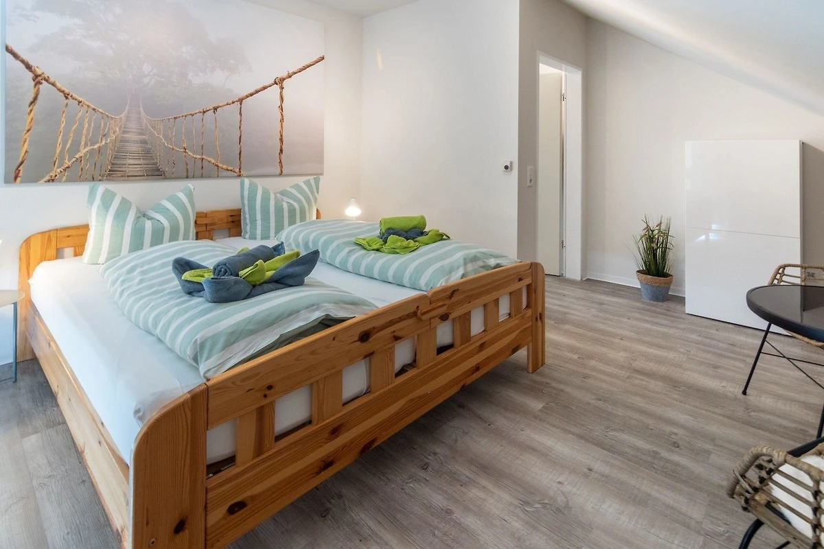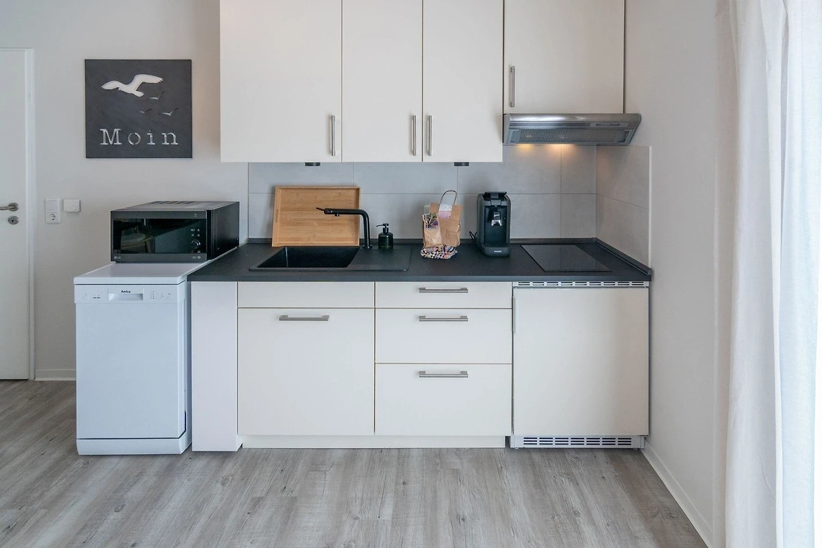 Diese charmante Ferienwohnung bietet eine helle und einladende Atmosphäre, ideal für einen erholsamen Aufenthalt. Der offene Küchenbereich ist modern ausgestattet und verfügt über einen Elektro-/Gasherd, Kühlschrank, Geschirrspüler sowie eine Kaffeemaschine und einen Toaster. Im behaglichen Schlafzimmer sorgt ein komfortables Doppelbett für eine entspannte Nachtruhe. Das Badezimmer mit Fenster ist mit einer Duschbadewanne ausgestattet und bietet einen Spiegel.
