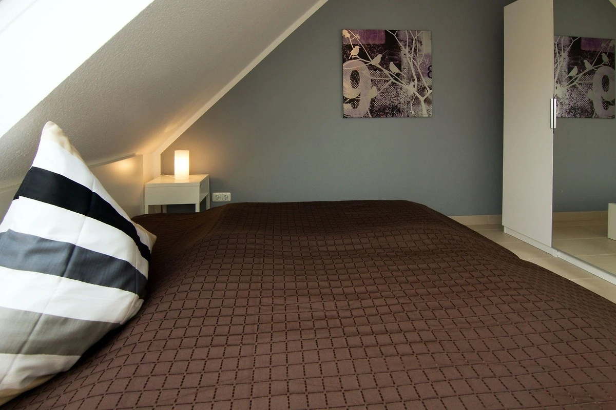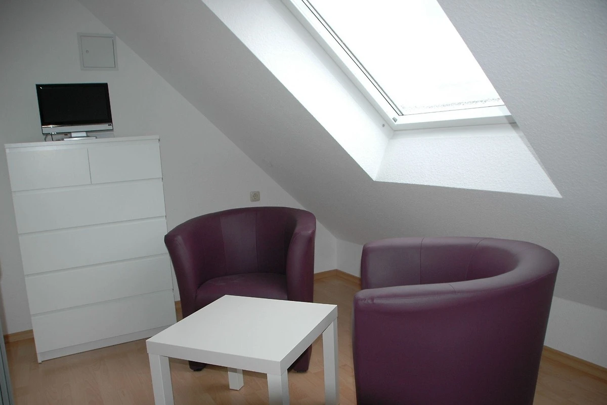 Weiter gehören zur Wohnung 2 freundliche Schlafzimmer, eins mit Doppelbett, das zweite im ausgebauten Dachgeschoss über eine Raumspartreppe zu erreichen. Das Badezimmer hat eine Dusche, Waschbecken und WC.