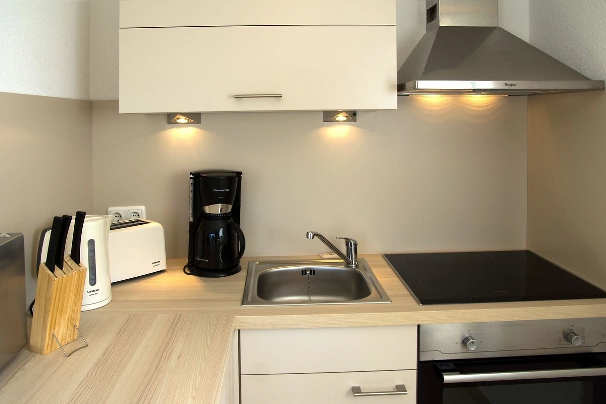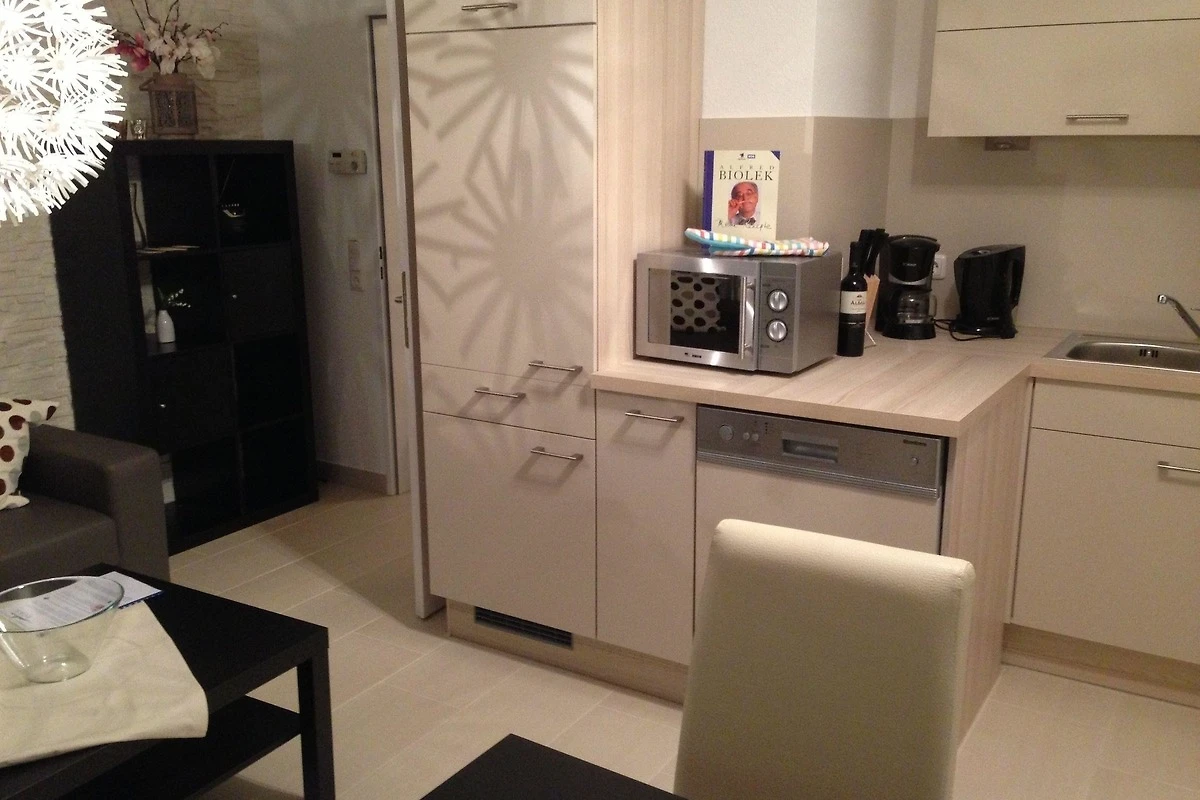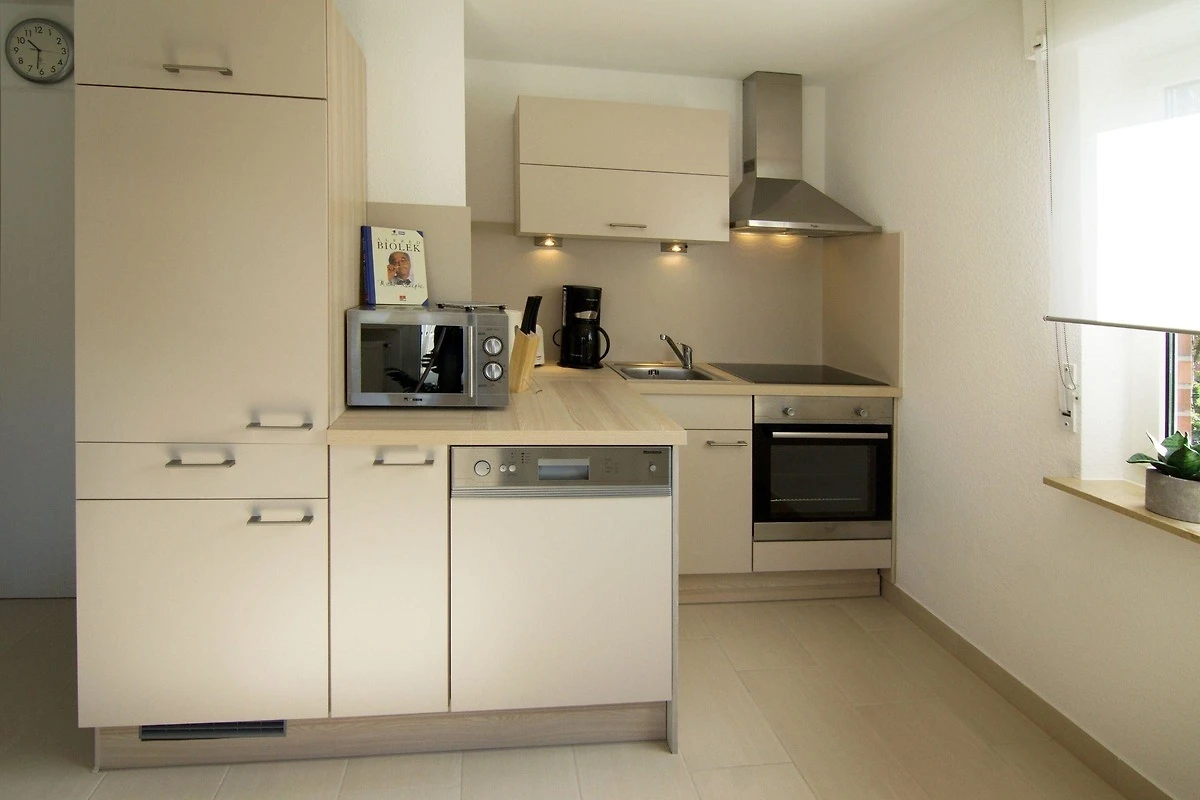 Die offene Küchenzeile ist mit allen, was man braucht ausgestattet und rundet diesen Raum ab. Spülmaschine, Backofen, Kühlschrank, Gefrierfach, Microwelle, Kaffeemaschine, Wasserkocher, Toaster und vieles mehr.