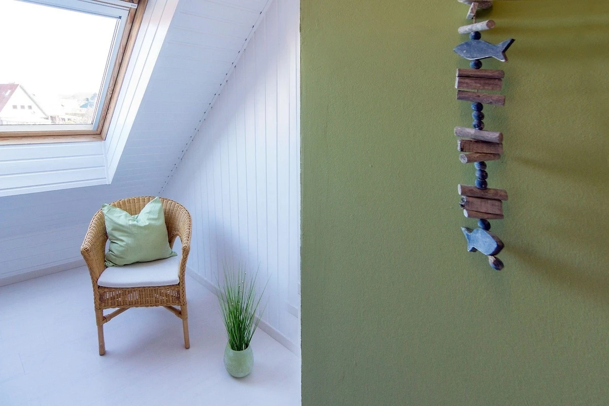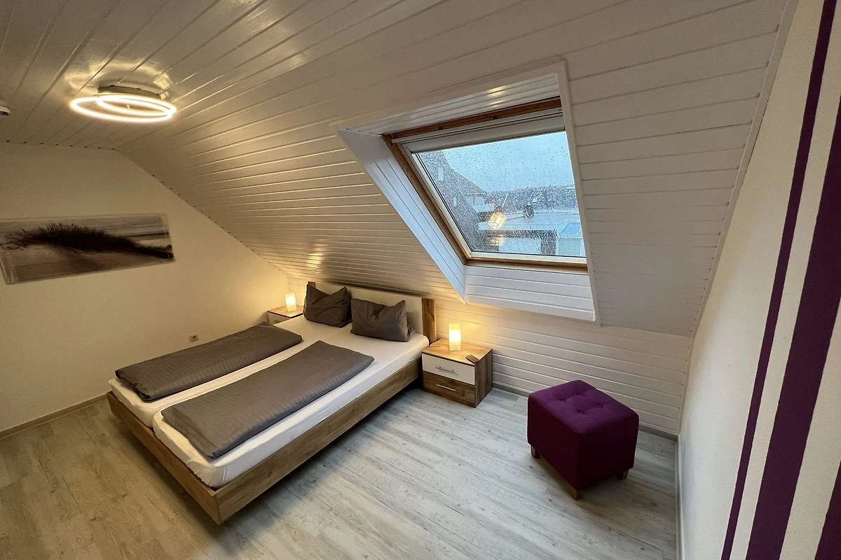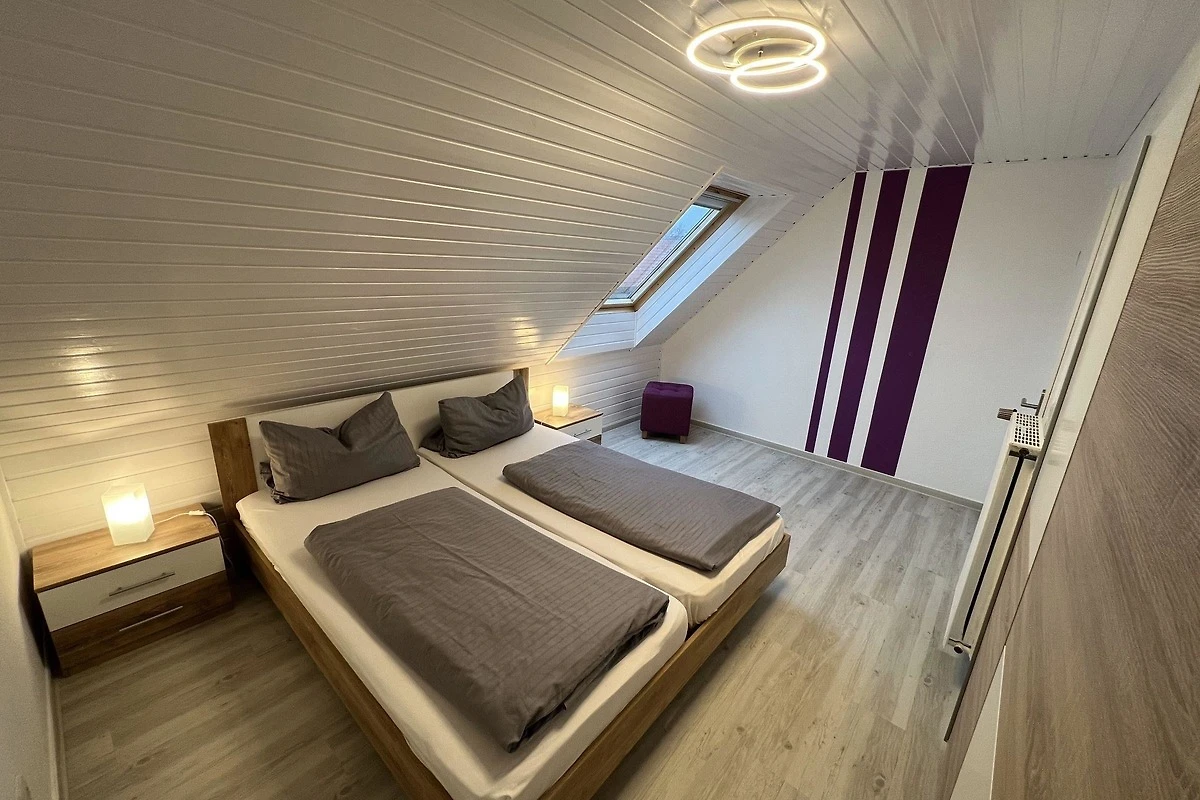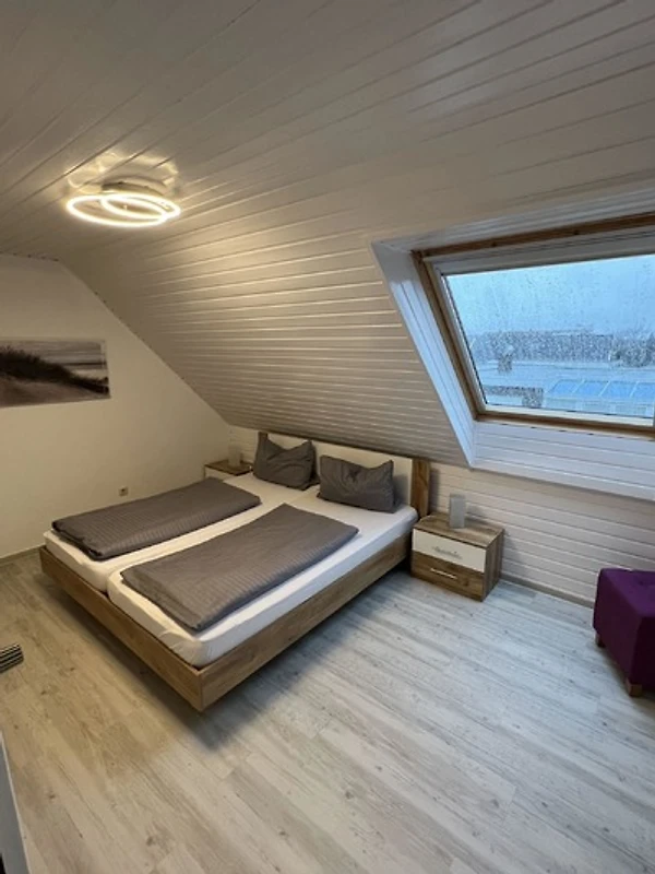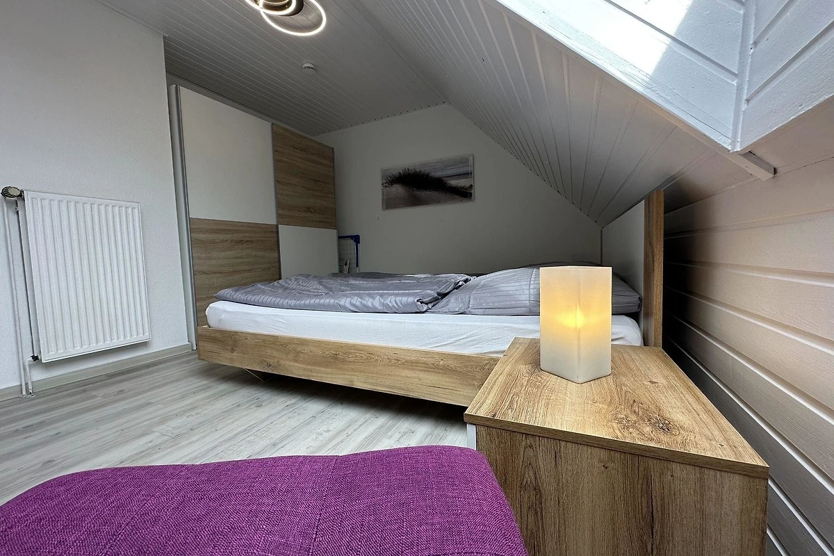 Weiter gehören zur Wohnung 2 freundliche Schlafzimmer mit jeweils einem Doppelbett. Das zweite Schlafzimmer im ausgebauten Dachgeschoss ist über eine Raumspartreppe zu erreichen. Das moderne Badezimmer hat eine Dusche, Waschbecken und WC.