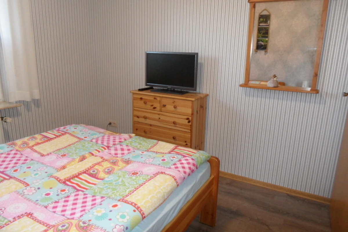 Das Schlafzimmer besteht aus einem Doppelbett , einer Komode und eine Flachbild - TV.