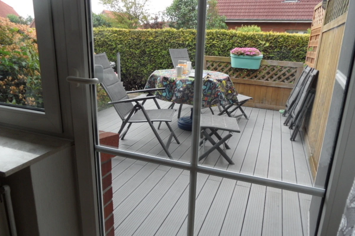 Zur Wohnung gehört auch eine schöne Terrasse mit vier Stühlen und einem Tisch sowie ein Parkplatz direkt am Haus.