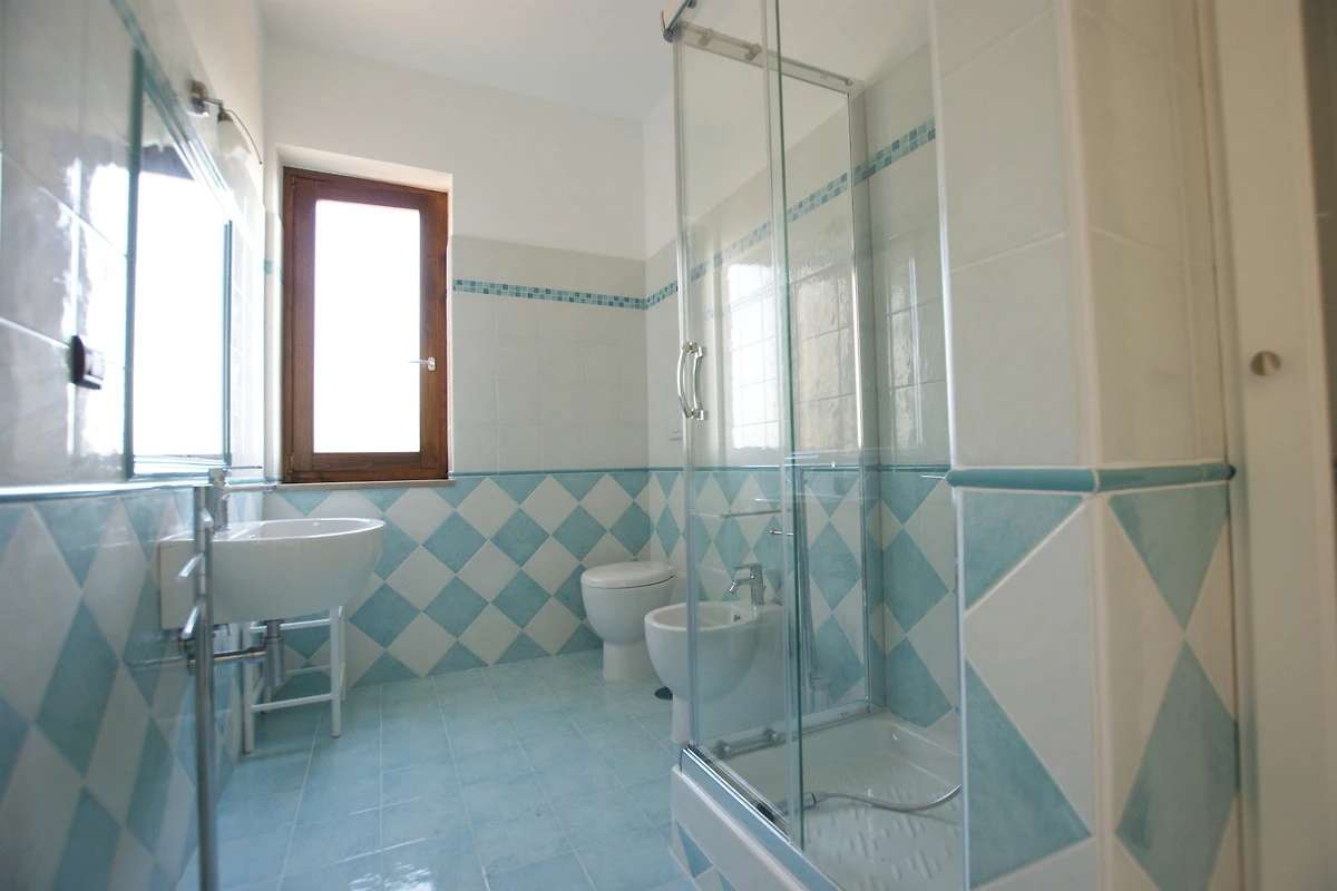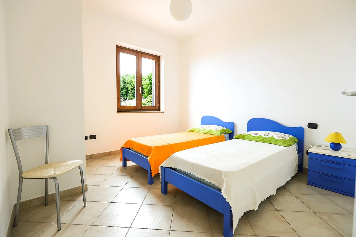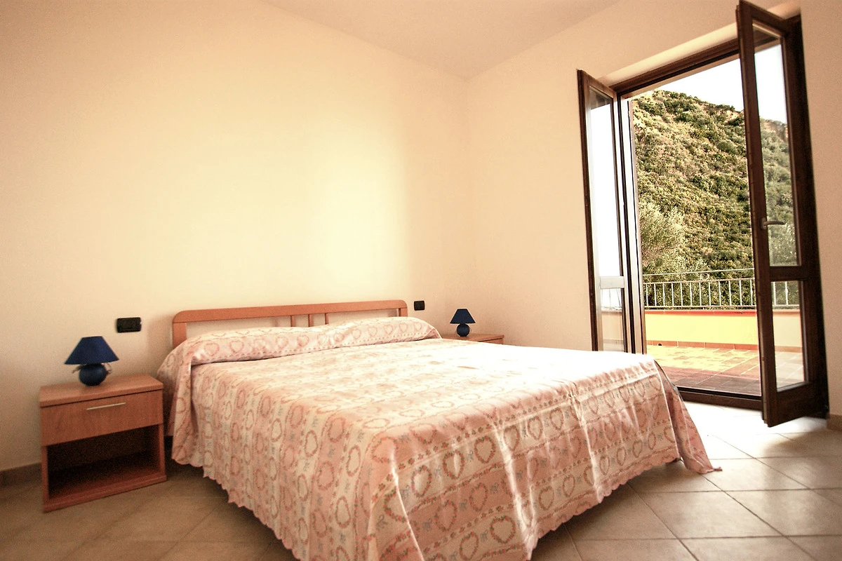 The 90 m² apartment on the first floor includes a large kitchen-dining-living room, 3 bedrooms, two with double bed and one with twin beds, and 2 bathrooms (shower/WC/bidet each). There are two 16 m² terraces and a small balcony to make yourself comfortable on in the southern sun. And, you get to enjoy a terrific panoramic view – your gaze roams from Capo Palinuro in the south to Punta Licosa in the north.