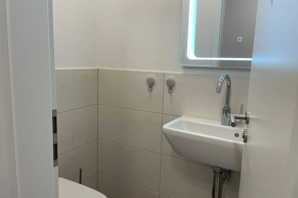 - ein geräumiges Bad mit Fenster, finnischer Sauna und bodentiefer Dusche mit Bonanza - Tür