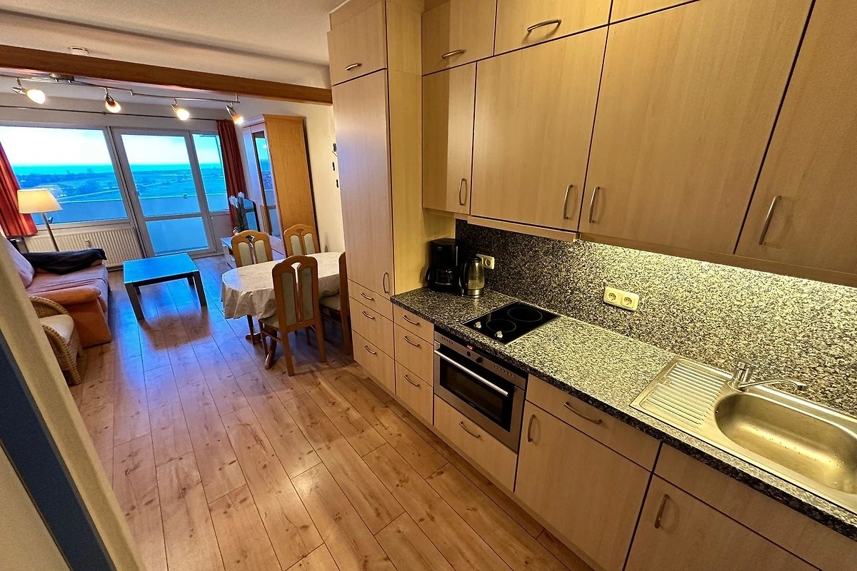 Das Appartement ist 40 m² gross (Ostseite) und befindet sich auf der 13. Etage im Haus Kiel. Ein grosses Bett im Schlafzimmer. ein grosses Schrankbett und ein Schlafsofa im Wohnzimmer bieten Platz für max. 4 Personen. Die ansprechende Sitzecke und die einladende Essecke laden zu gemütlichem Verweilen ein. Die komplette ausgestattete Einbauküche bietet alles Notwendige für die Selbstversorgung.