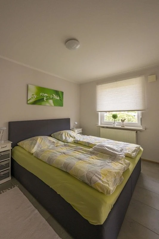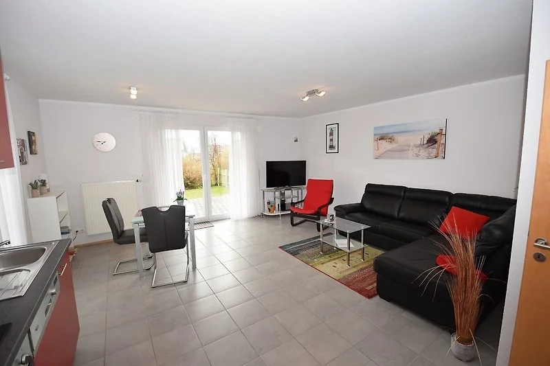 Die Ferienwohnung „Nordlicht-Panten“ eignet sich ideal für zwei Personen und besticht durch ihre helle, moderne Ausstattung. Der Wohnraum ist lichtdurchflutet und umfasst eine grosse Fensterfront, die direkt zur Terrasse führt. Hier laden ein bequemes Sofa und ein Sessel zum Entspannen ein, ergänzt durch einen Fernseher. Die offene Küche ist gut ausgestattet mit Herd, Backofen, Kühlschrank, Kaffeemaschine, Wasserkocher, Toaster und einer Spülmaschine, wodurch auch anspruchsvolles Kochen im Urlaub ermöglicht wird. Das komfortable Schlafzimmer bietet ein grosses Doppelbett und genügend Stauraum in einem grossen Schrank. Das moderne Duschbad ist mit einer Glastür, einem Waschtisch mit Spiegel und einem Fön ausgestattet. WLAN ist ebenfalls verfügbar, und ein PKW-Stellplatz gehört zur Wohnung. Die Wohnung befindet sich im neuen Wohn-/Feriengebiet Kranichring, nur etwa 750 Meter vom Sandstrand entfernt.