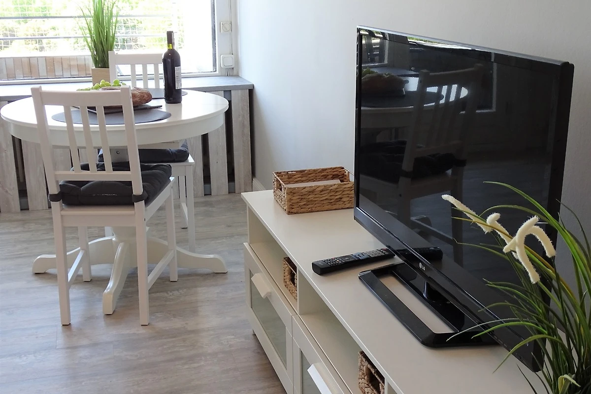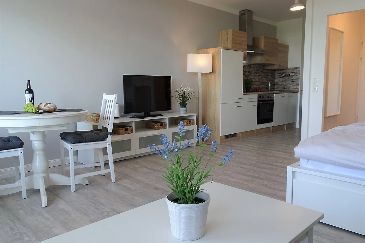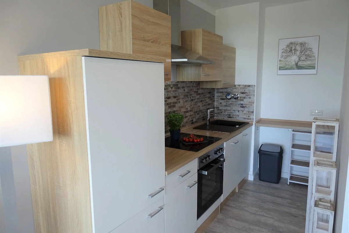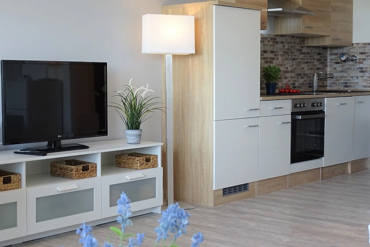Aufgeteilt ist das Ferienobjekt in: Wohn-Schlafbereich mit LCD TV, bequemem Sofa, Esstisch mit Bestuhlung und neuer moderner Küchenzeile. Ein Badezimmer mit Dusche und WC ist ebenfalls vorhanden. Die Einbauküche beinhaltet Backofen, Kühlschrank mit integriertem Gefrierfach, Geschirrspüler, Kaffeemaschine, Toaster und Wasserkocher.