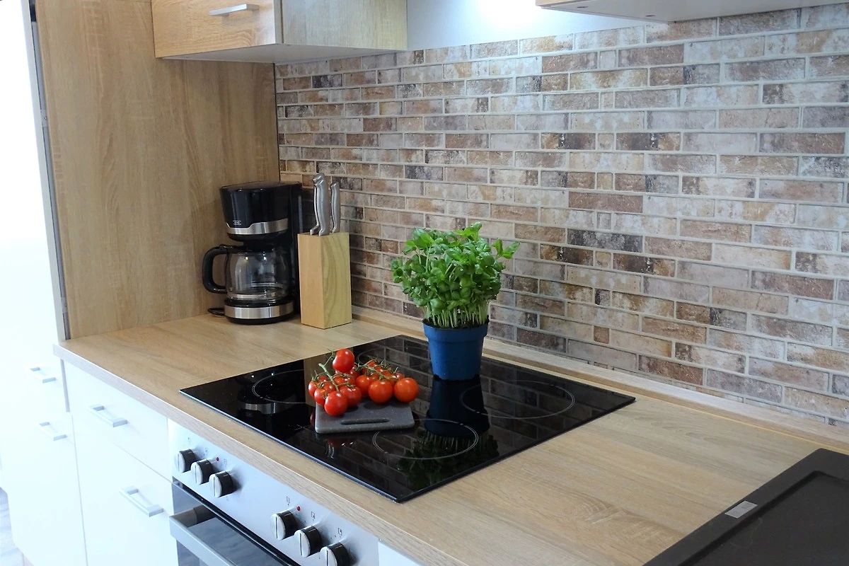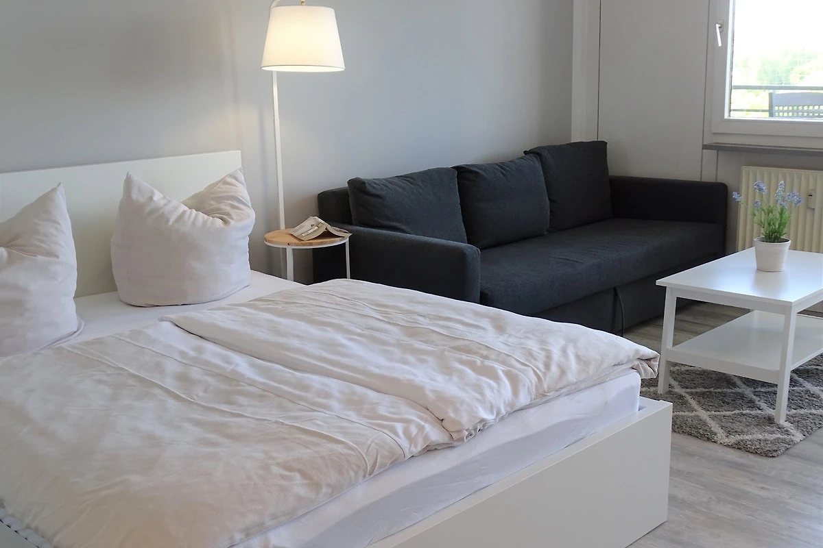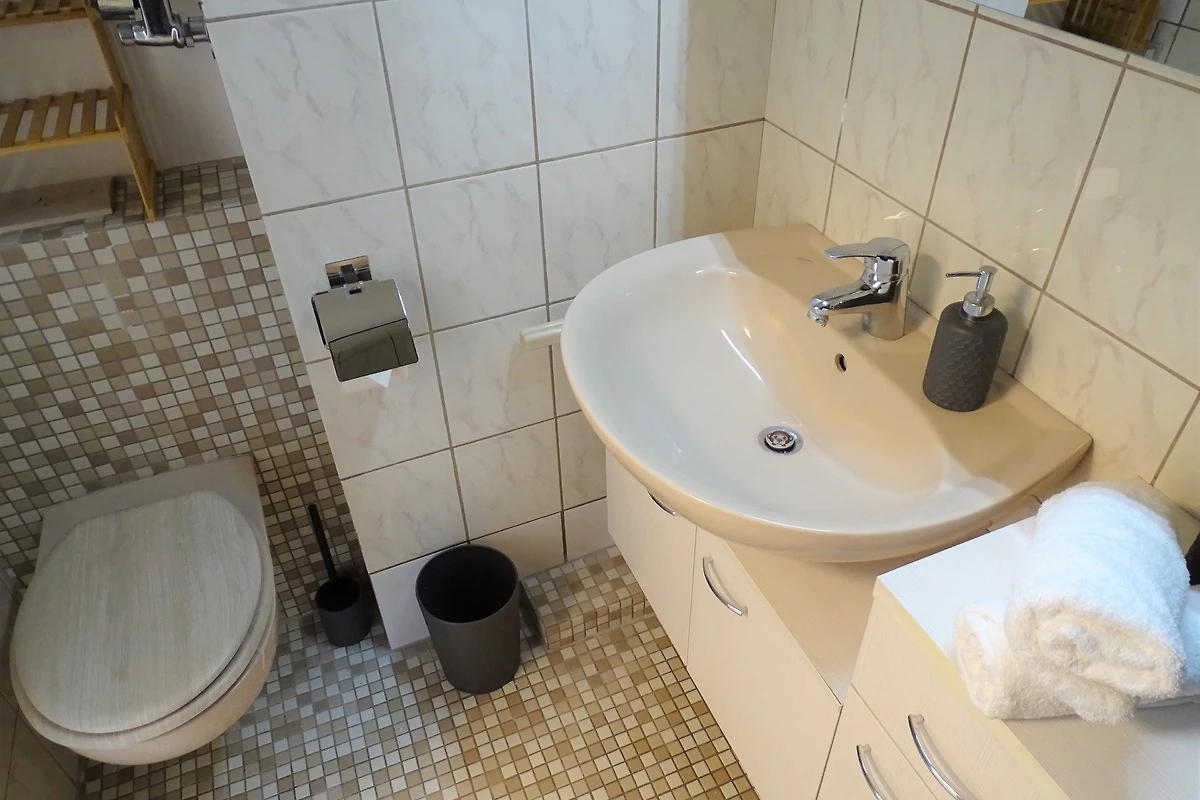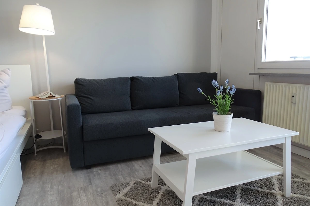 Aufgeteilt ist das Ferienobjekt in: Wohn-Schlafbereich mit LCD TV, bequemem Sofa, Esstisch mit Bestuhlung und neuer moderner Küchenzeile. Ein Badezimmer mit Dusche und WC ist ebenfalls vorhanden. Die Einbauküche beinhaltet Backofen, Kühlschrank mit integriertem Gefrierfach, Geschirrspüler, Kaffeemaschine, Toaster und Wasserkocher.