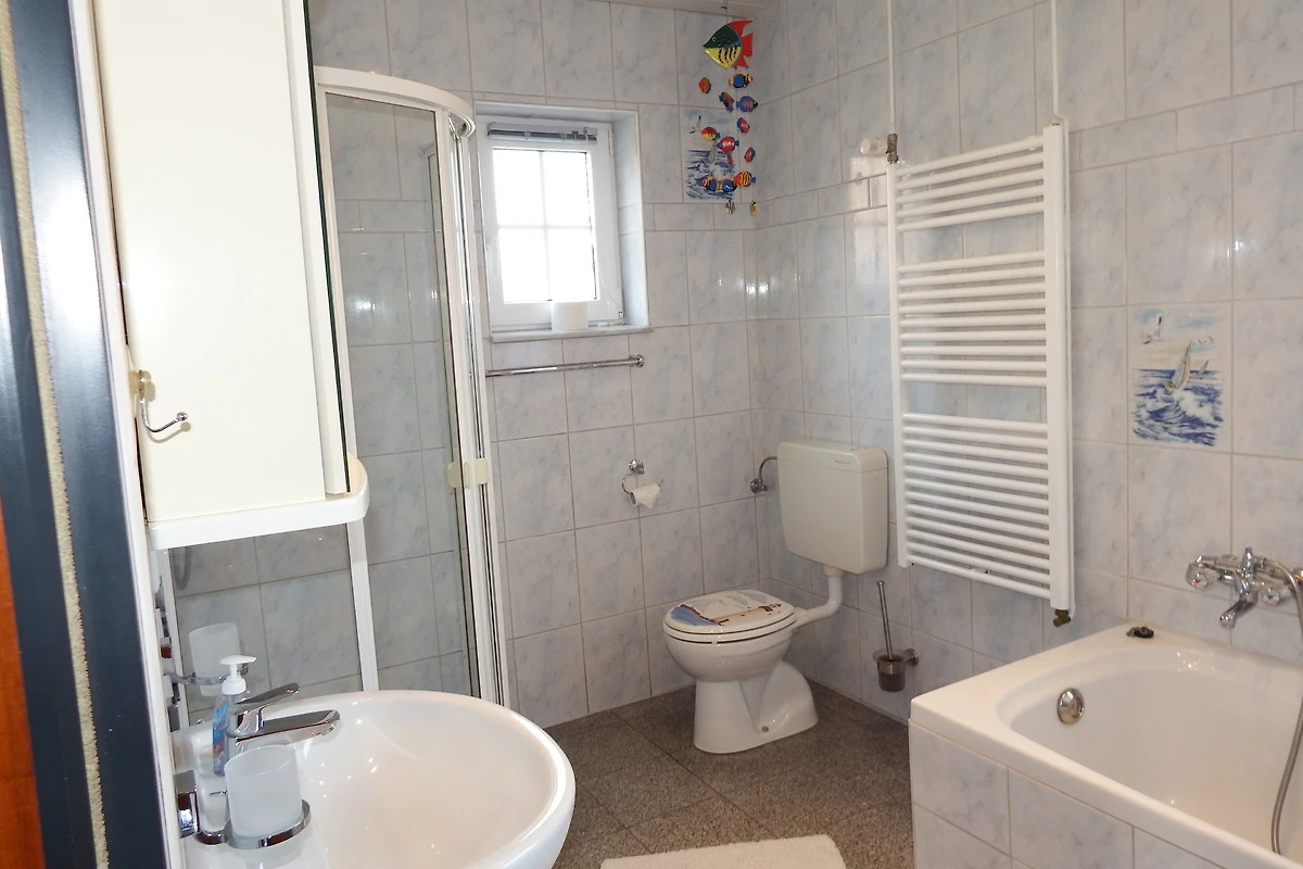 Zur Linken befindet sich das geräumige Bad, in dem Dusche, Badewanne, WC und ein grosses Waschbecken vorhanden ist.