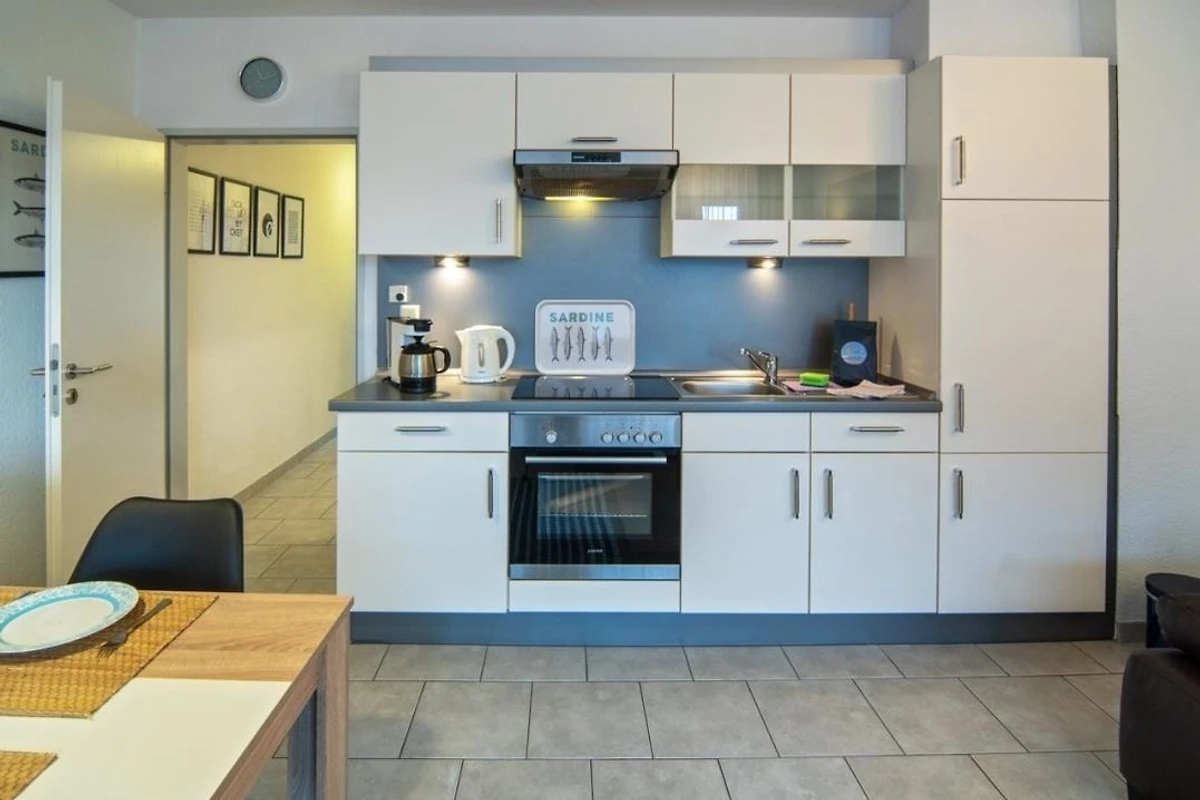 Die im Wohnbereich eingebundene geräumige Küchenzeile bietet allen notwendigen Komfort, um gemeinsam zu kochen und zu speisen. Zur Ausstattung gehören ein Cerankochfeld, ein Backofen, ein Kühlschrank, eine Kaffeemaschine, eine Mikrowelle, ein Toaster sowie ausreichend Geschirr, Besteck und Gläser. Der Esstisch bietet Platz für bis zu vier Personen.