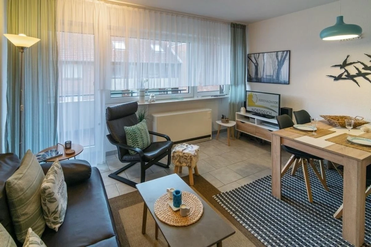 Über den Wohnraum führt Sie der Weg direkt auf den Balkon, der mit einer praktischen Sitzgruppe ausgestattet ist. Hier können Sie sitzen und die wohltuende Nordseeluft geniessen.