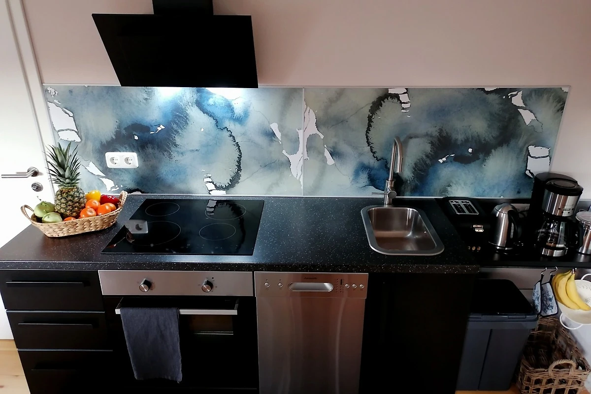 Die komfortabel eingerichtete Küchenzeile bietet alles was es für die Lust am Kochen braucht (Kaffeemaschine, Wasserkocher, Toaster, Ceran-Kochfeld, Backofen, Mikrowelle, Kühlschrank mit Gefrierfach).