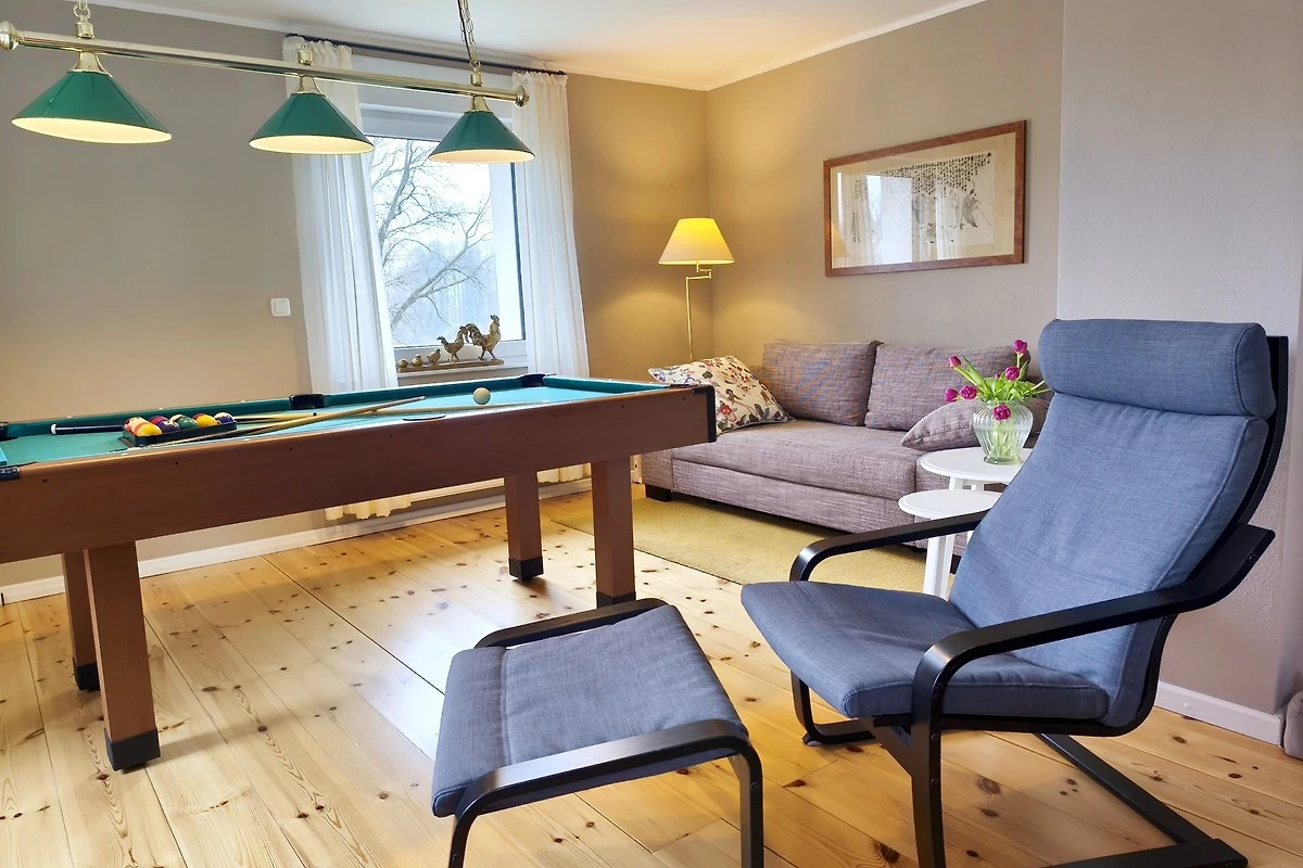 Hier stehen auch der Billardtisch, ein grosser Esstisch und eine bequeme Sitzecke für Sie bereit. Netflix and chill auf 43 Zoll oder eigene Konsole an den TV, mit unserem kostenlosem W-LAN ist alles möglich .