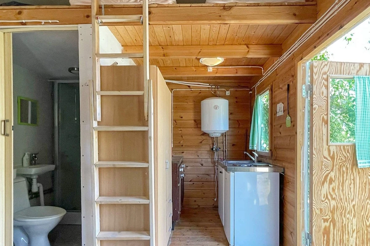 Küche(Kochherd(elektrisch), Mikrowelle, Kühlschrank(+ Gefrierfach)), Wohn-/Schlafzimmer(Doppelklappbett ), Badezimmer(Waschbecken, Dusche, Toilette), Heizung(elektrisch), Garten, Gartenmöbel, Parkplatz