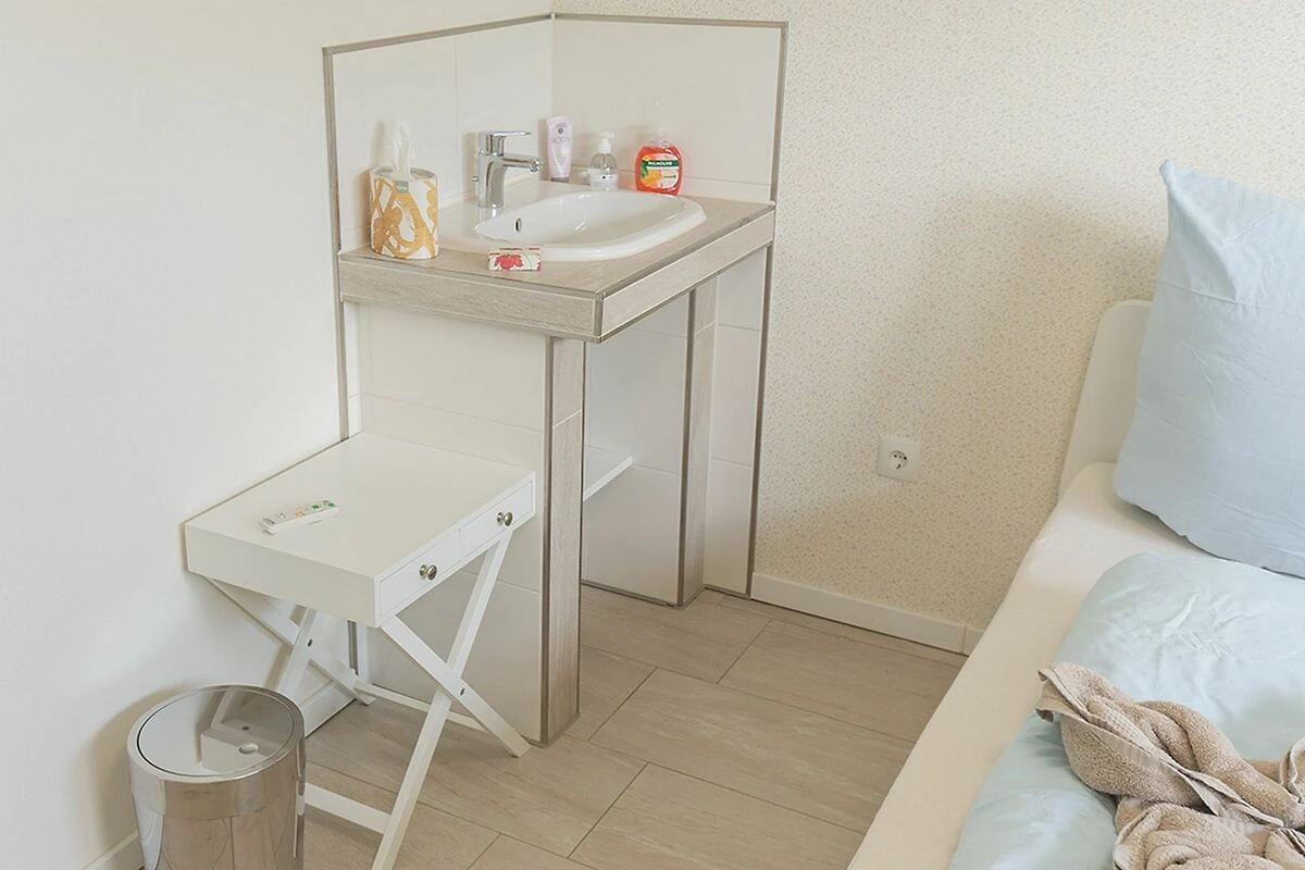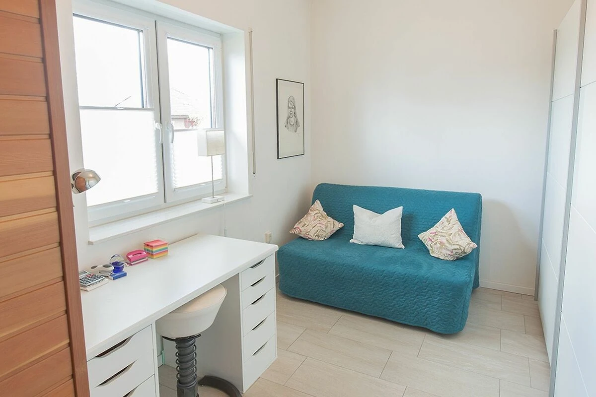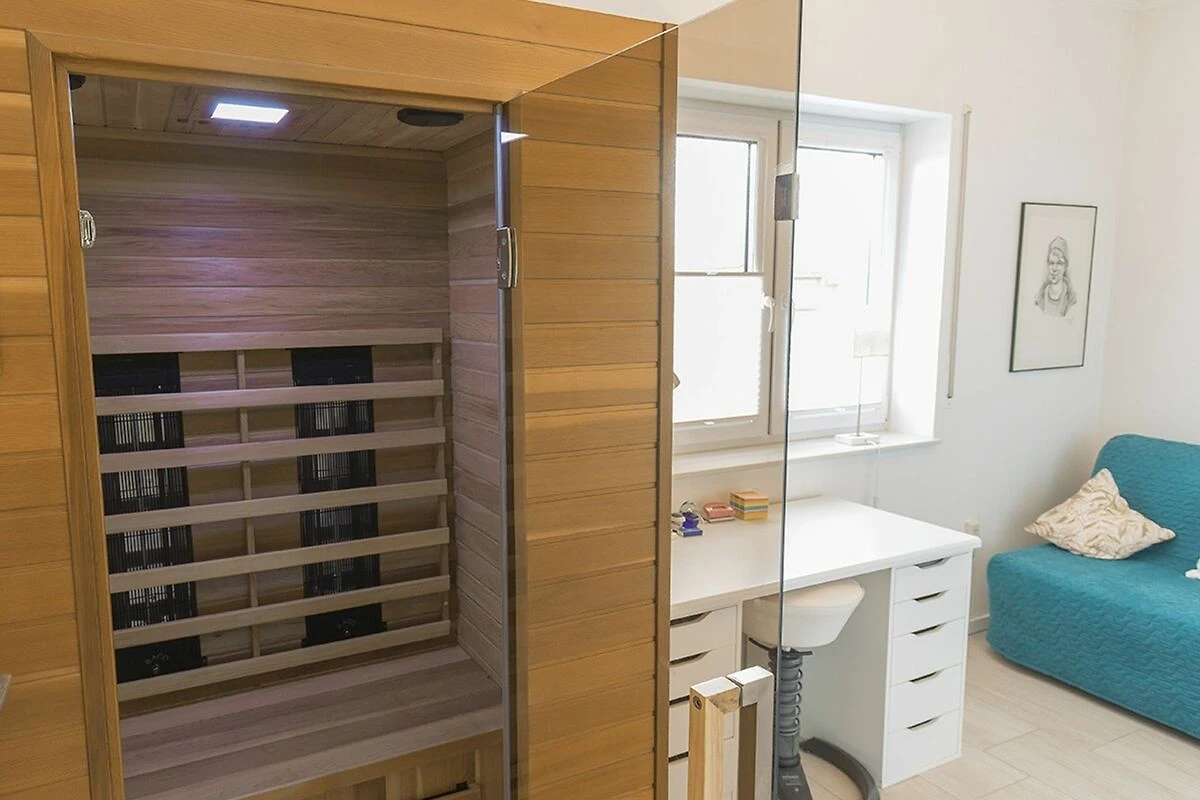 Das Haus verfügt über drei Schlafräume mit je einem Doppelbett und mit einem ausziehbaren Schlafsofa 140x200 cm. Das Schlafsofa befindet sich im Kinderzimmer und dort können Sie in der Infrarotsauna Wärme tanken. Oder nutzen Sie den Schreibtisch im Rahmen ihrer Workation.