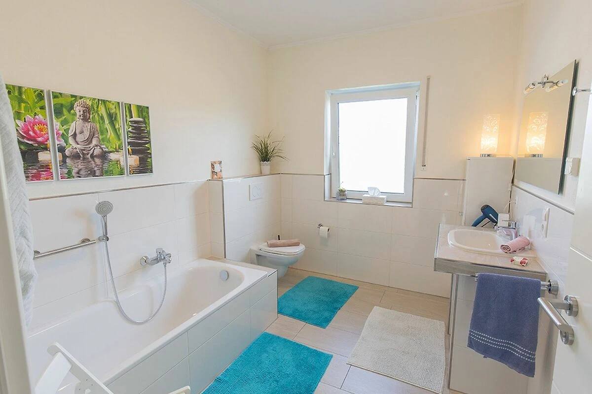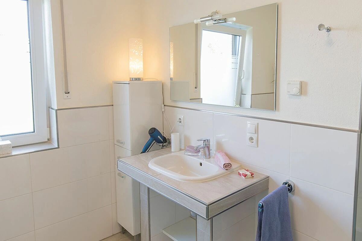Das Fenster-Bad hat eine Wanne und eine Walk-In-Dusche sowie viel Platz für Kosmetika.