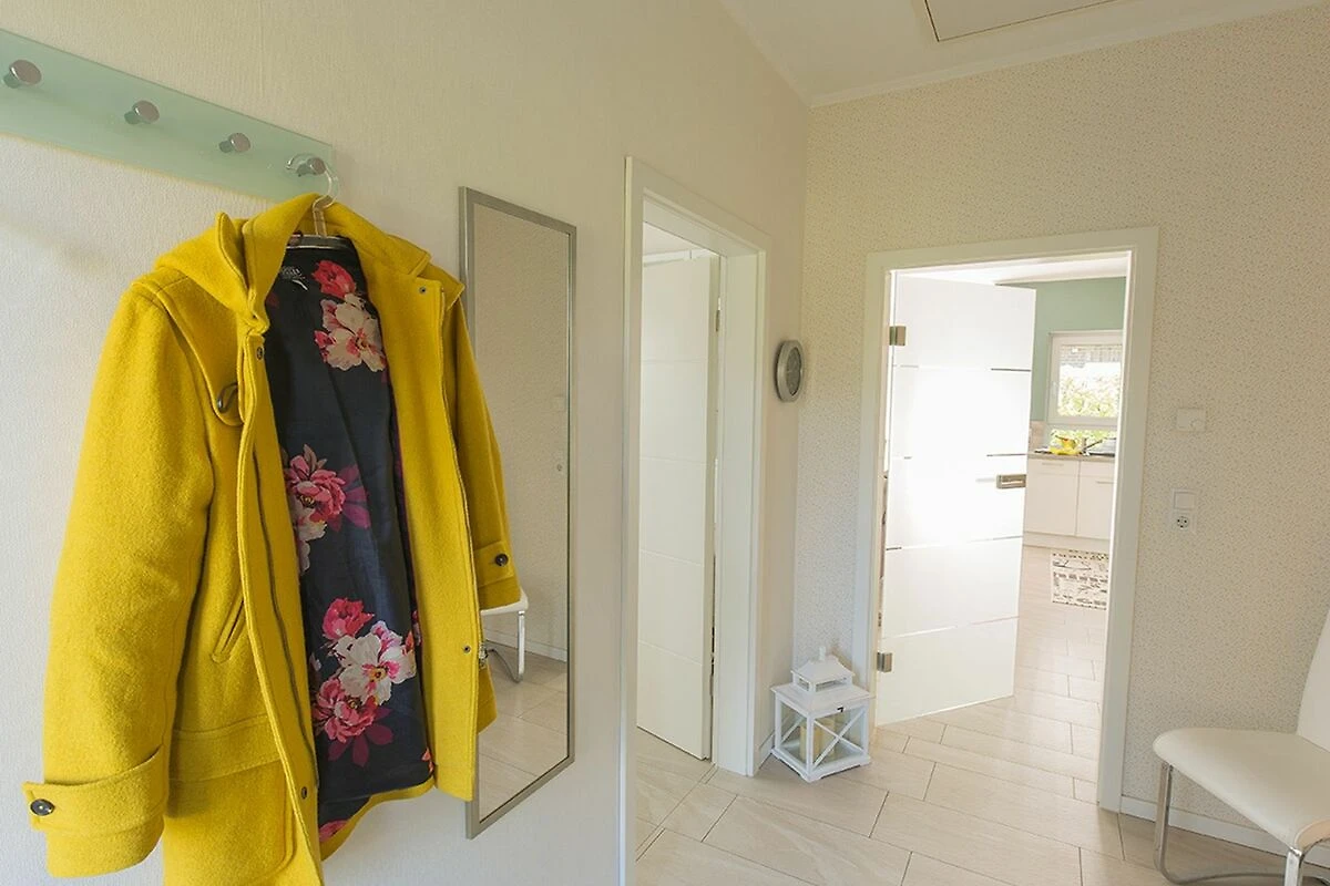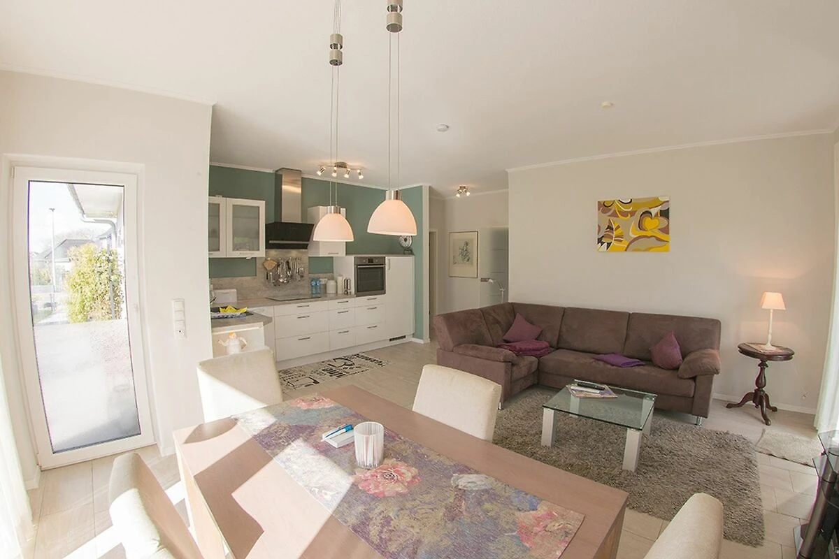 Sie parken direkt vor dem Haus - eine Garage ist vorhanden. Durch den hellen Dielenbereich gelangen Sie in das lichtdurchflutete Wohnzimmer mit integrierter L-Küchenzeile und dem Essplatz mit Ausgang zu den beiden Terrassen und der grossen Liegewiese mit Strandkorb.