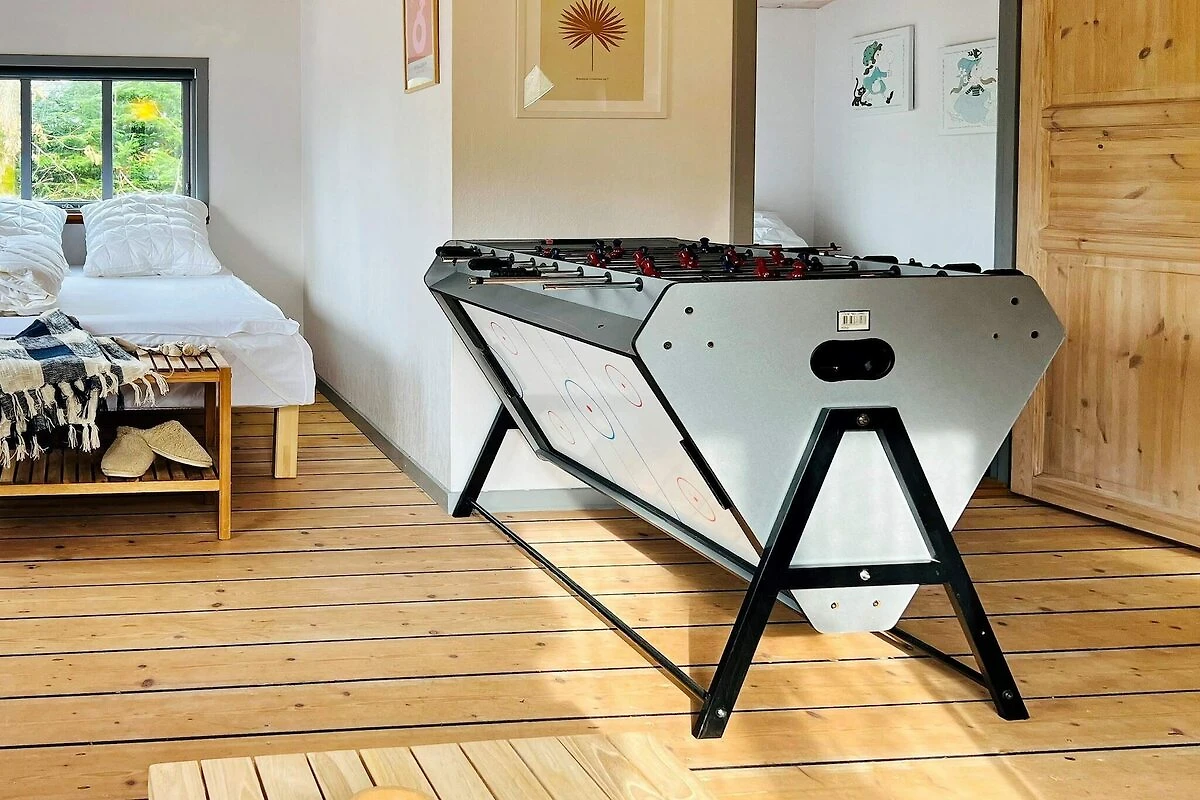 , Küche(Kochherd(elektrisch), Kaffeemaschine, Mikrowelle, Spülmaschine, Kühlschrank, Tiefkühlschrank(60-99L)), Wohn-/Schlafzimmer(TV, Hochstuhl, Chromecast), Schlafzimmer(Doppelbett, Babybett), Schlafzimmer(2x Einzelbett, Doppelbett), Badezimmer(Trockner, Waschbecken, Dusche, Toilette, Waschmaschine), Badezimmer(Waschbecken, Dusche, Toilette), Badewanne(im Garten, erwärmt, 6 Personen), Heizung(elektrisch), Terrasse, Gartenmöbel, Tischfußball, Air-Hockey, Dart, Billard, Fischreinigungstisch, Luft-Luft-Wärmepumpe