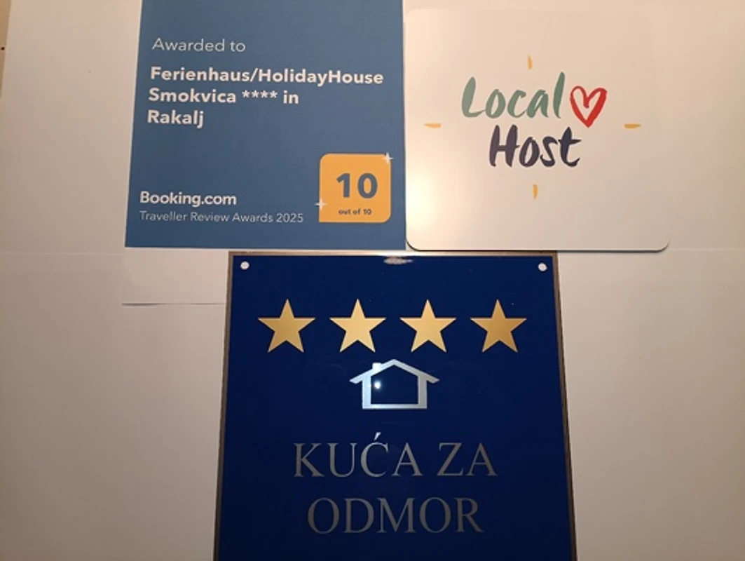 Ihren Erholungsurlaub im Ferienhaus Smokvica können Sie auch auf Booking.com (wo es mit 10/10 bewertet ist) oder auf der Seite Novasol/Awaze anschauen. Es wurde von der kroatischen Tourismusverwaltung mit vier Sternen ausgezeichnet und erhielt vom Tourismusverband Marčana die Auszeichnung „Lokaler Gastgeber“.