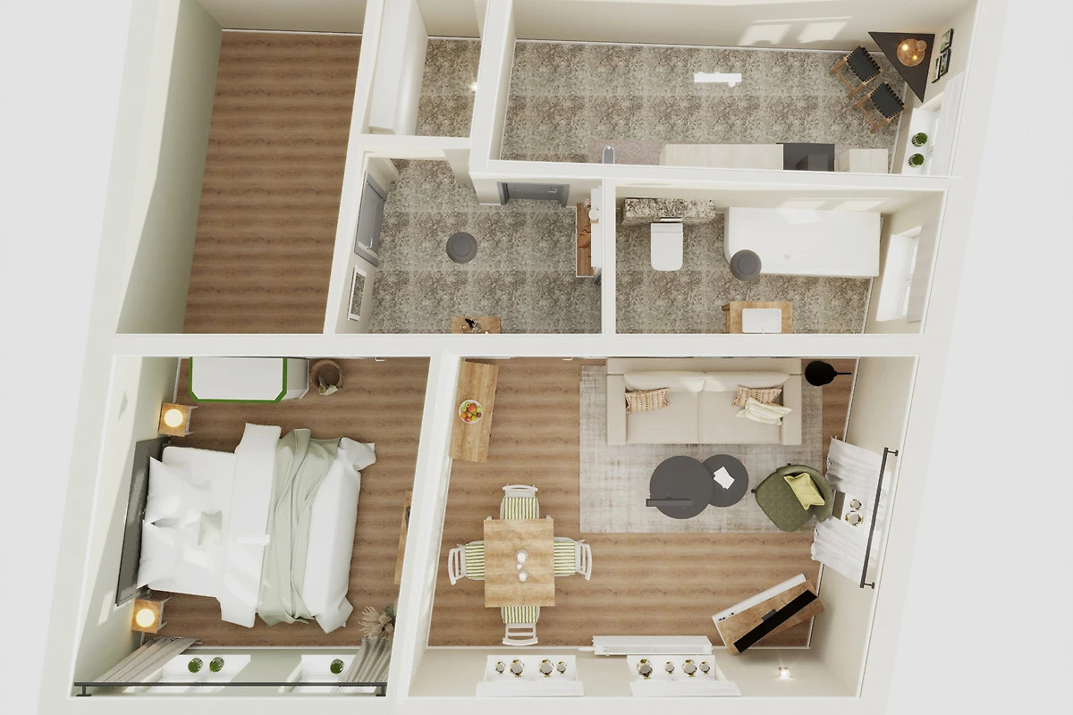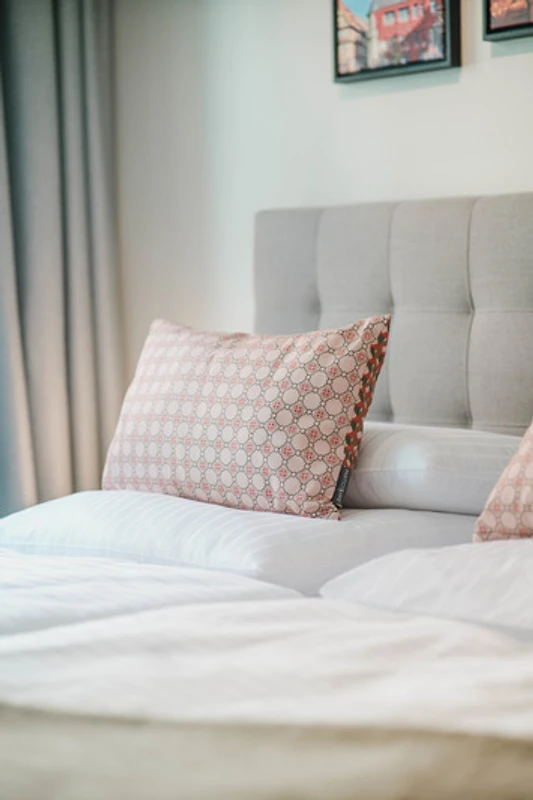 • Das Schlafzimmer verfügt über einen Kleiderschrank und ein Boxspringbett (180 x 200 cm) in hochwertiger Hotelqualität. Das Bett ist bei Anreise bezogen.