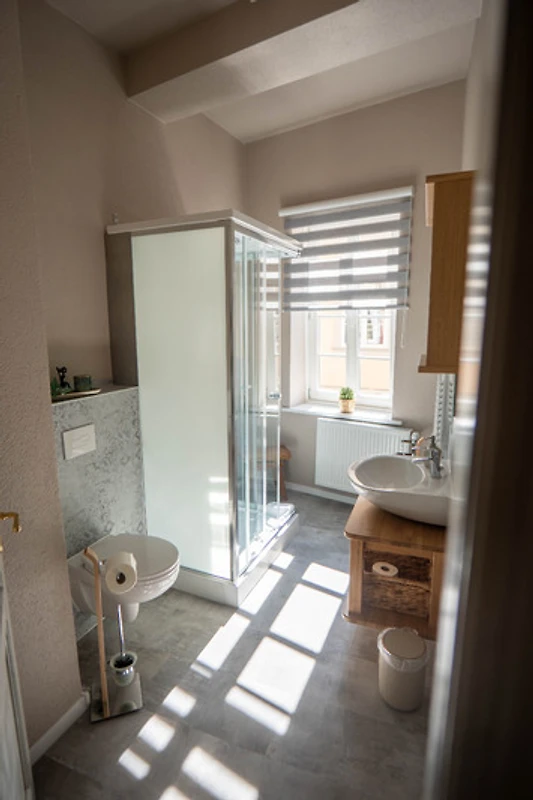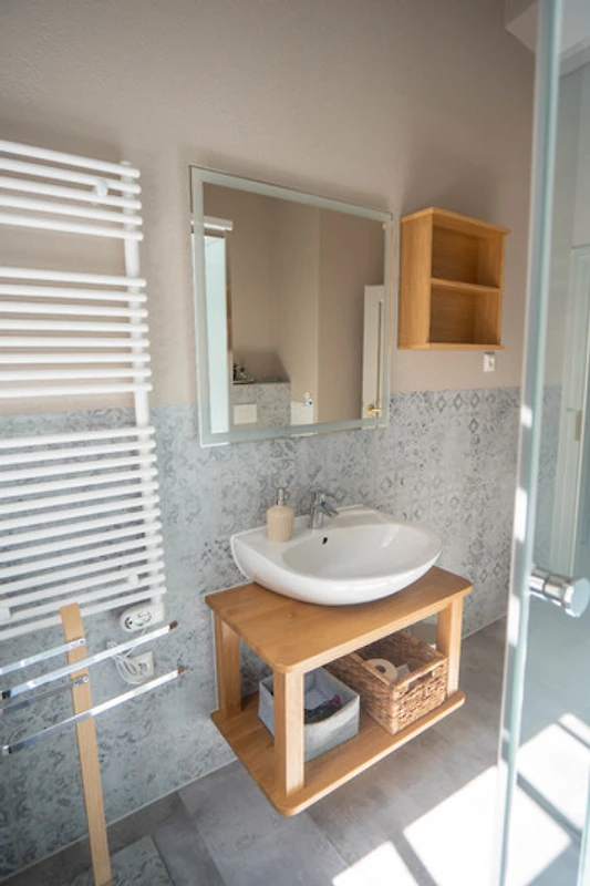 • Das Bad ist mit Duschwanne, Waschtisch und WC ausgestattet. Handtücher werden bereitgelegt.
