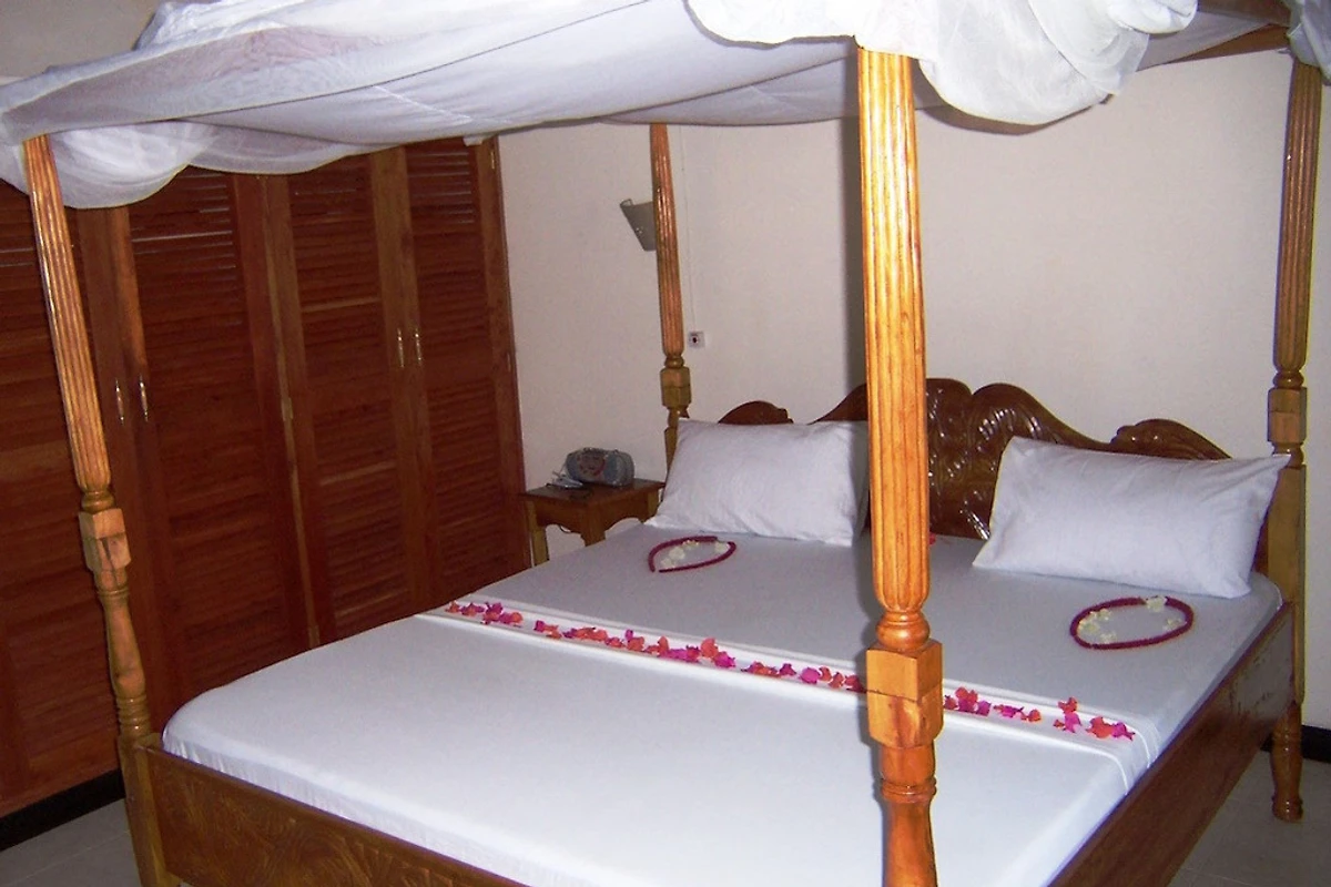 Das hohe Makuti-Dach sorgt zusammen mit groß dimensionierten Giebelöffnungen für ein angenehmes Raumklima ohne Klimaanlage. Zusätzliche Abkühlung ist in allen Schlafräumen durch Deckenventilatoren gewährleistet.