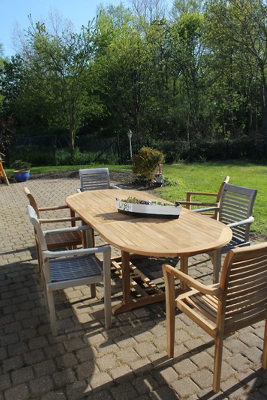 Der Essbereich hat einen Tisch mit 6 Stühlen und das Wohnzimmer verfügt über 2 Sofas 2 Ohrensessel, kl.Couchtisch und einen Fernseher.