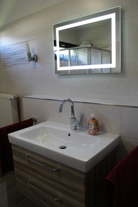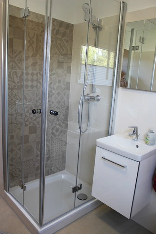 1 Bad, mit Dusche, Waschtisch, Toilette und Schränkchen