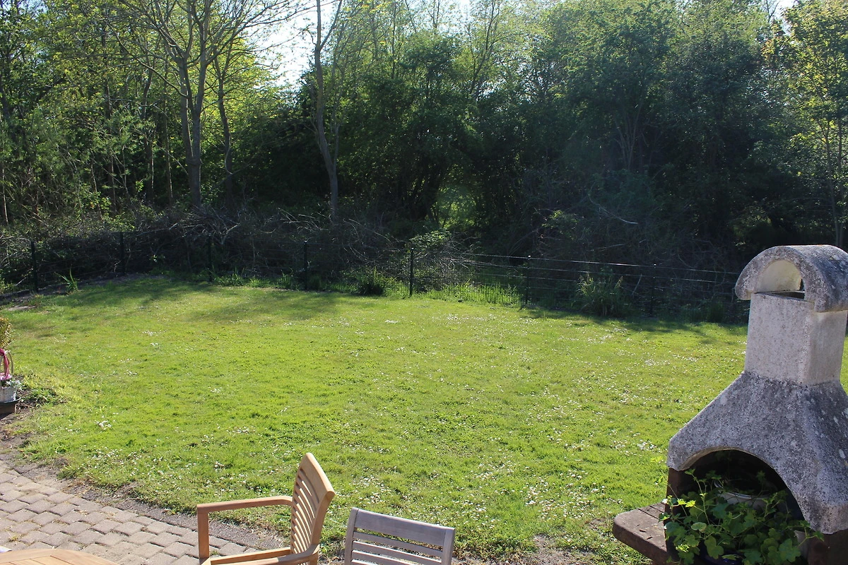 Der Garten ist eingezäunt und hat noch eine Terrasse mit einer Markise.