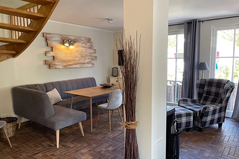 Im Erdgeschoss finden Sie ein grosszügiges Entreè, einen gemütlichen Wohn- und Essbereich mit Kaminecke, einem Hauswirtschaftsraum sowie einem Schlafzimmer mit Doppelbetten und ein dazugehöriges Duschbad.