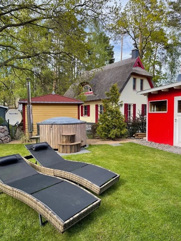 Im Aussenbereich befindet sich der hübsch angelegte Garten mit Saunahaus, Schuppen und einem beheizbarem Badezuber (ganzjährig) mit Aussendusche.
