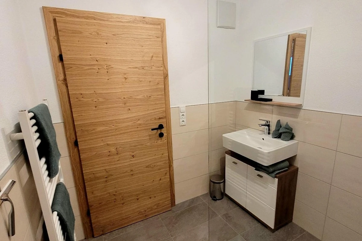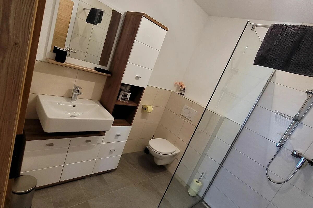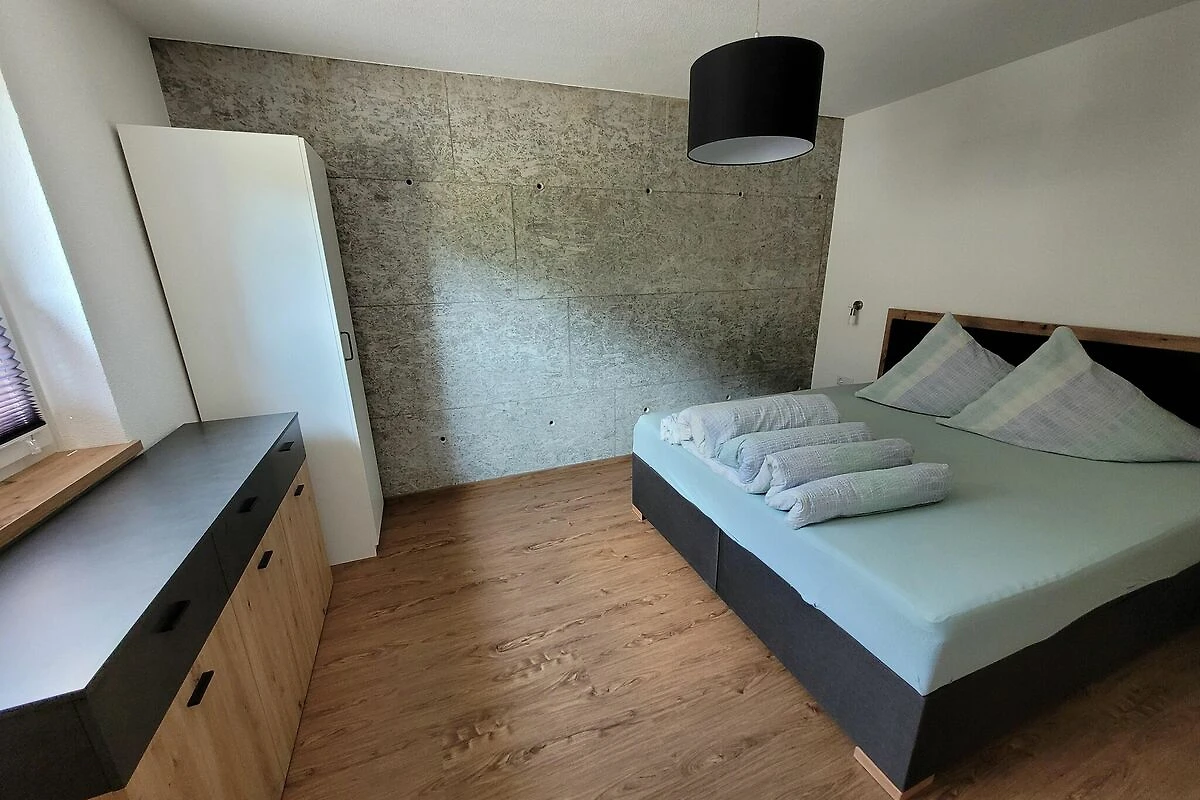 In der 1. Etage: (offene Küche(Kochplatte, Kaffeemaschine, Backofen, Kühlschrank), Wohn/Esszimmer(Doppelschlafcouch, TV, Esstisch), Schlafzimmer(Doppelbett), Badezimmer(Dusche, Toilette), Terrasse)