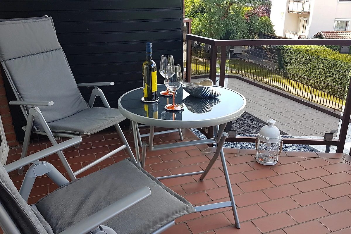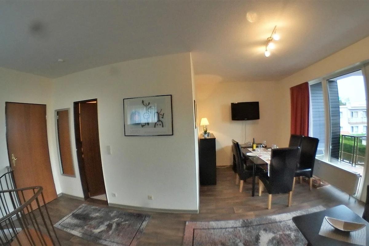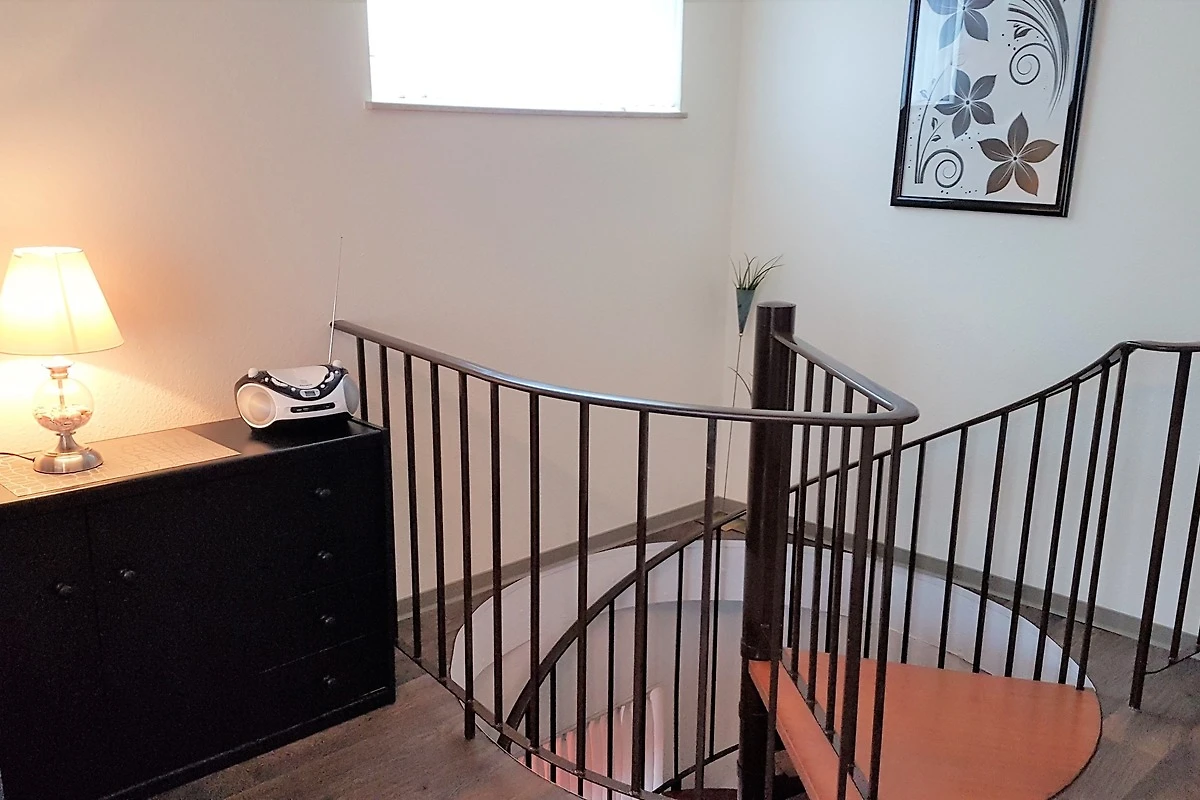Die Ferienwohnung ist sehr geschmackvoll mit viel Liebe zum Detail eingerichtet. Die Eingangsbereiche befinden sich im Erdgeschoss sowie im 1. Stock. Somit haben Sie zwei komfortable Zugänge zur Wohnung. Im Erdgeschoss befindet sich das vollkommen neu renovierte Duschbad und das Schlafzimmer sowie eine eigene Terrasse. Von hier gelangen Sie über eine Wendeltreppe in den Wohnbereich mit Essecke und separater Küche sowie dem grosszügigen Balkon mit Abstellraum. Im Wohnzimmer befindet sich eine Couchecke (Schlafsofa), ein Flatscreen-TV (SAT) und der Essbereich. Die vollausgestattete separate Küche verfügt über einen 4er-Kochplattenherd mit Backofen, Kühlschrank, Geschirrspüler sowie die üblichen Küchenutensilien.