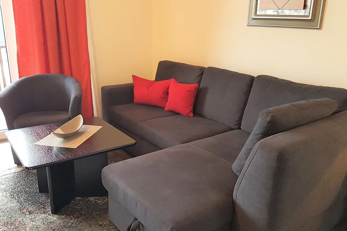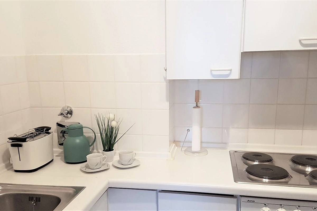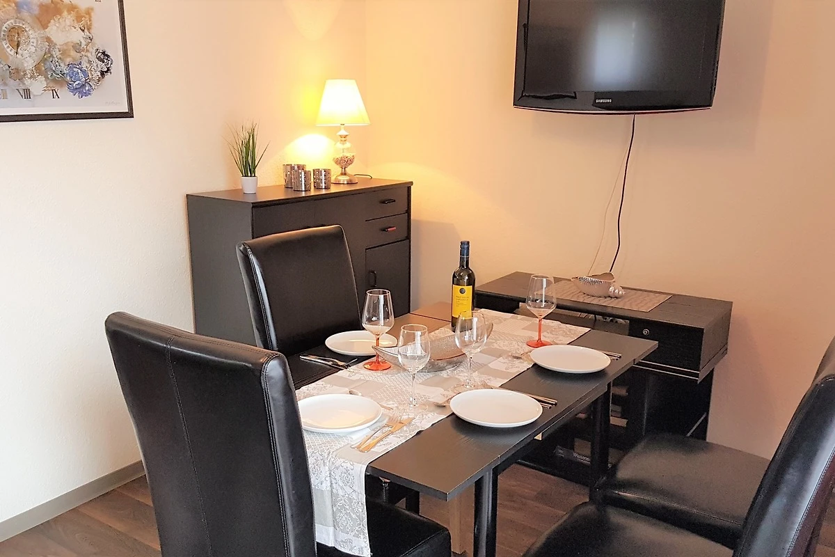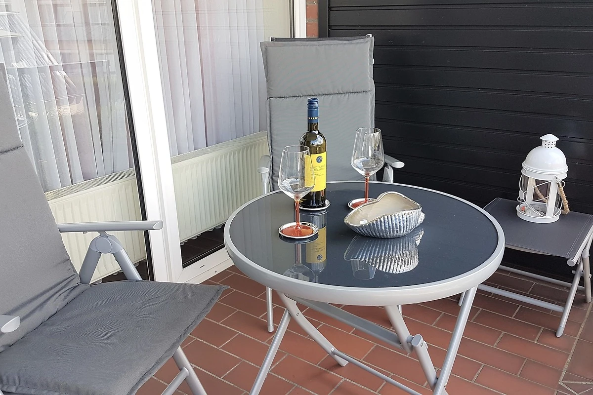 Die Ferienwohnung ist sehr geschmackvoll mit viel Liebe zum Detail eingerichtet. Die Eingangsbereiche befinden sich im Erdgeschoss sowie im 1. Stock. Somit haben Sie zwei komfortable Zugänge zur Wohnung. Im Erdgeschoss befindet sich das vollkommen neu renovierte Duschbad und das Schlafzimmer sowie eine eigene Terrasse. Von hier gelangen Sie über eine Wendeltreppe in den Wohnbereich mit Essecke und separater Küche sowie dem grosszügigen Balkon mit Abstellraum. Im Wohnzimmer befindet sich eine Couchecke (Schlafsofa), ein Flatscreen-TV (SAT) und der Essbereich. Die vollausgestattete separate Küche verfügt über einen 4er-Kochplattenherd mit Backofen, Kühlschrank, Geschirrspüler sowie die üblichen Küchenutensilien.