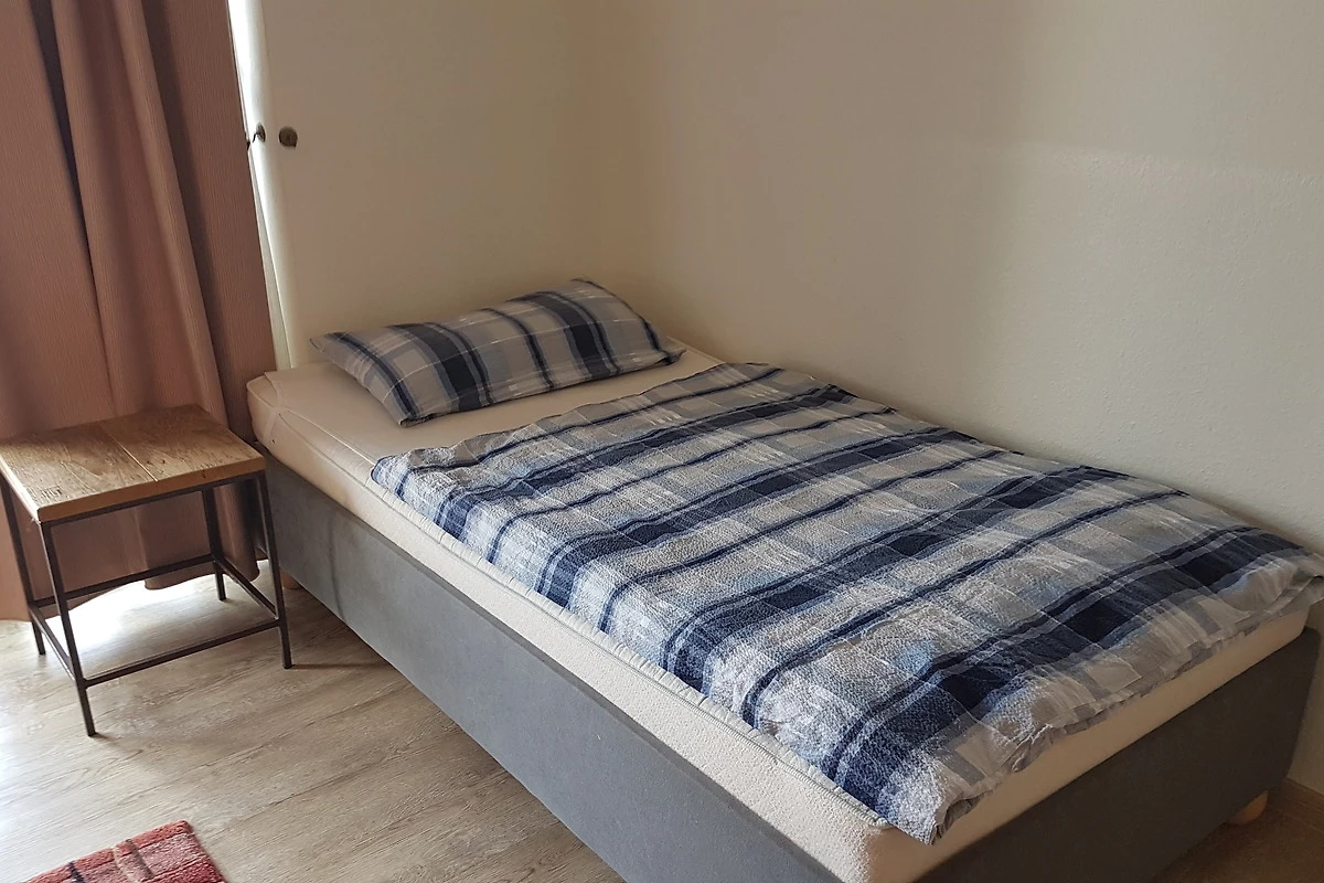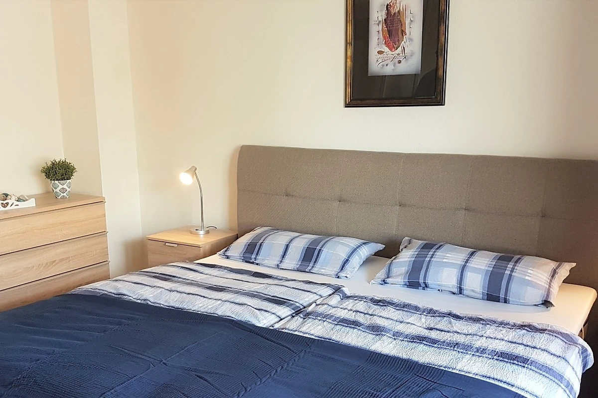 Im Schlafzimmer erwartet Sie ein neues Doppelbett mit Matratze und Topper in der Grösse von 180x200 cm, ein weiteres Bett mit den Massen 100x200 cm sowie ein grosszügiger Schiebetürenkleiderschrank. Hier sorgen Rollos und Verdunkelungsvorhänge für erholsamen Schlaf.