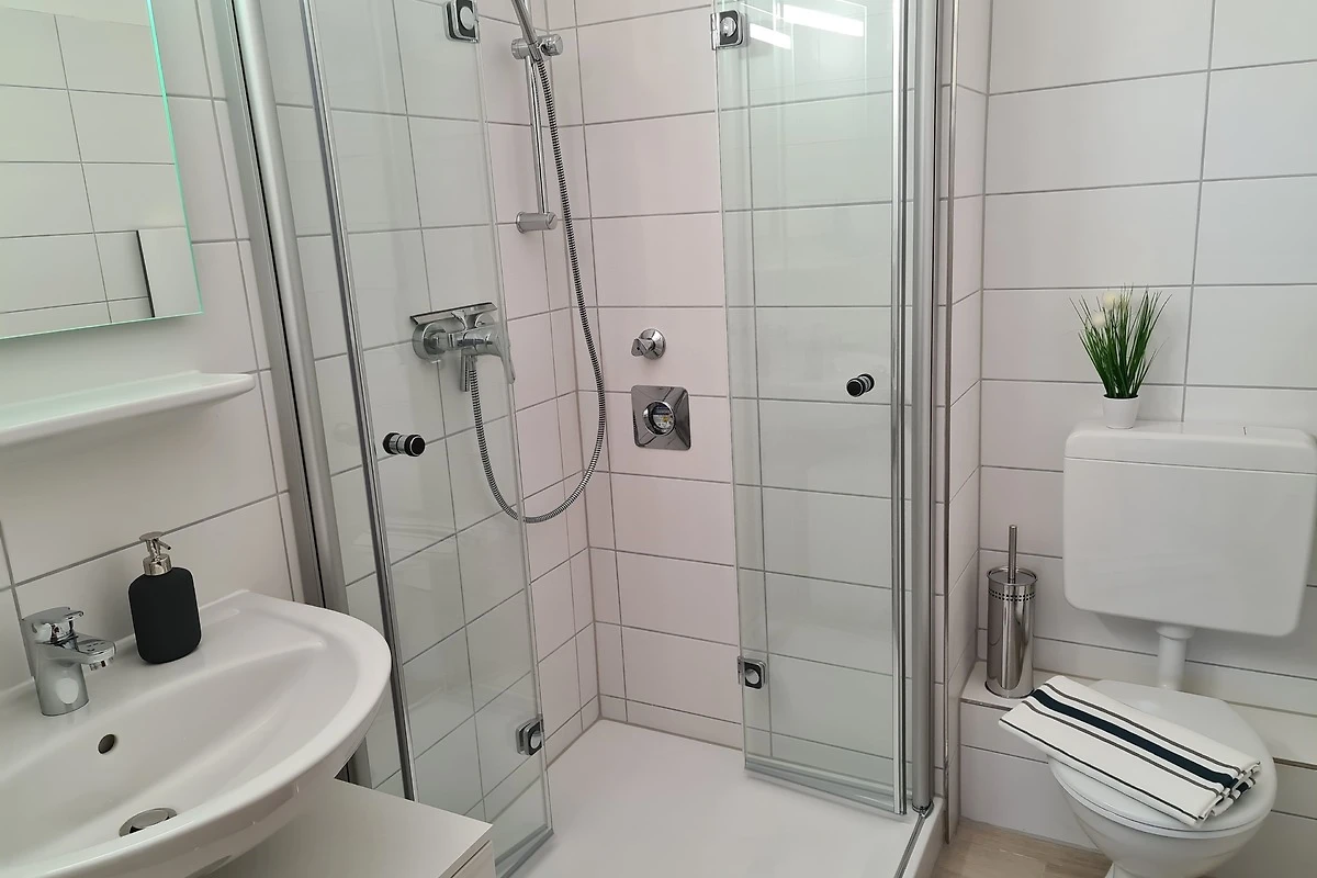 Das funktionelle Bad ist ausgestattet mit Dusche, WC und Haartrockner.