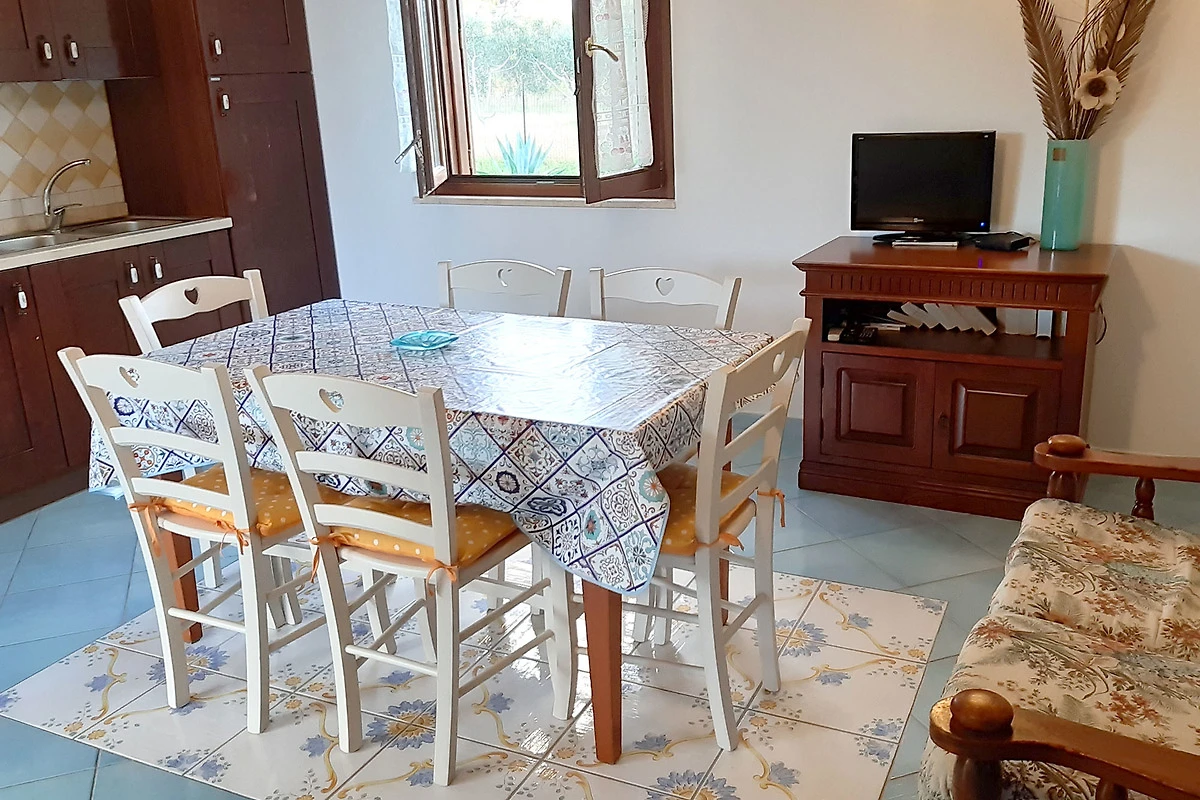 Via the spacious, roofed and furnished terrace, you enter Villino Dora into the live-and-eat-in kitchen (incl. oven, 4-burner gas stove, refrigerator with freezer compartment) with dining furniture and sofa. Next to the kitchen lies a twin bedroom. The bathroom (shower/WC/bidet) and the second bedroom (double bed), which looks out onto the garden, are accessible from the hallway.